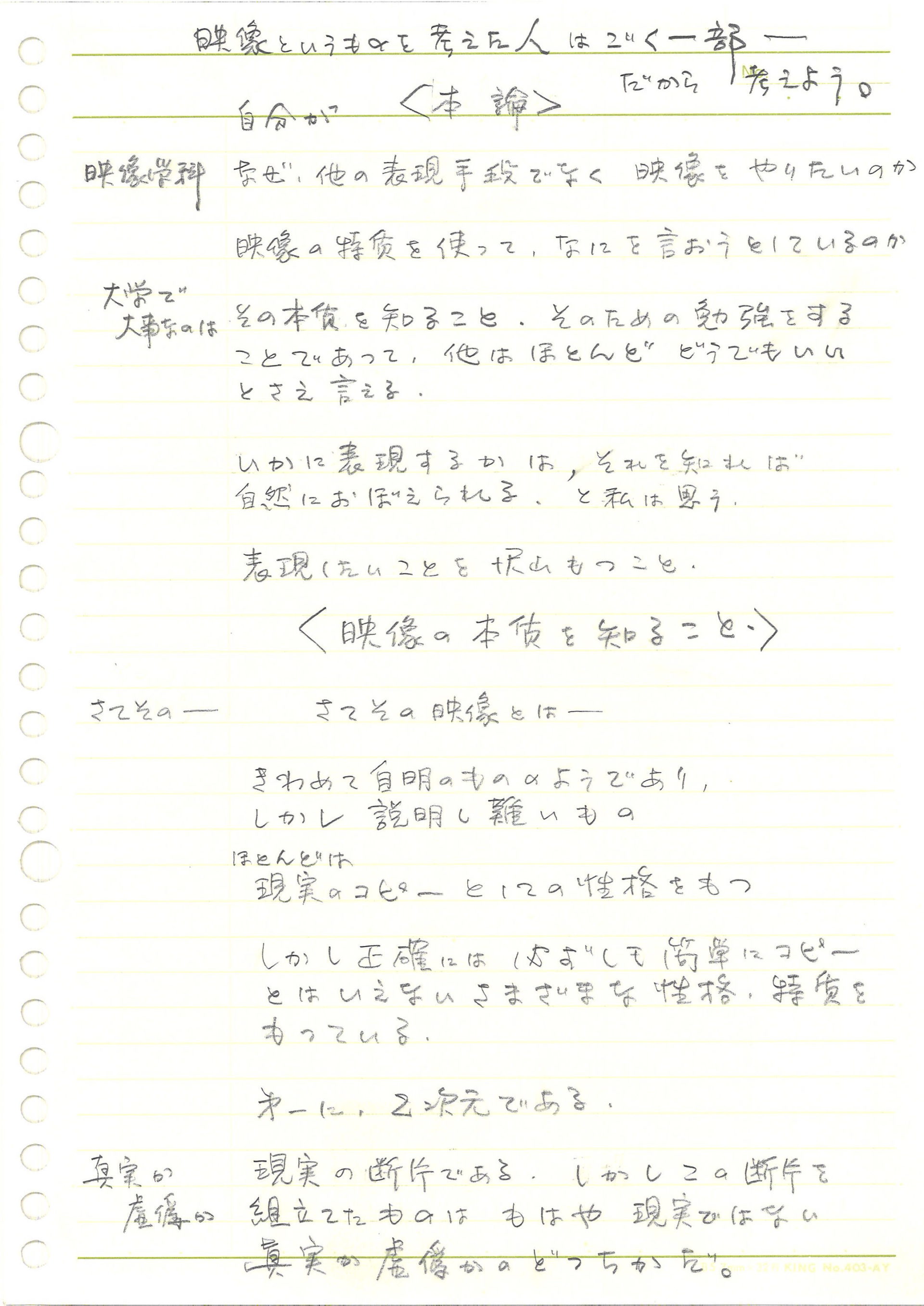 私も本当はよくわからないのですが、いろんなことを言いますから、映像とは何かということ、映像の本質とは何かということを考えるヒントにしてもらいたいと思います。