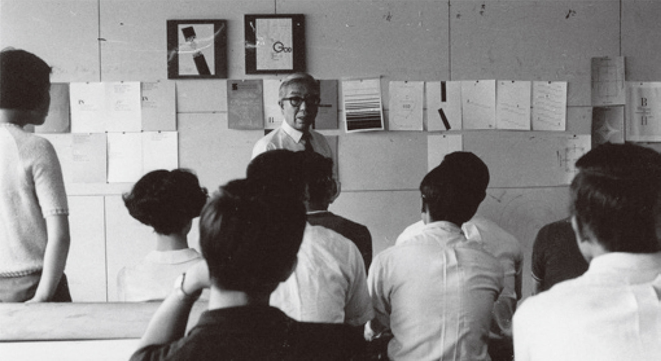 55年に「海を返せ」で日宣美賞を受賞された粟津潔先生が19 62年 に、武蔵野美術学校に非常勤で着任しています。 63年に専任講師、 64年に助教授になりました。この年、武蔵野美術大学研究紀要Ⅱに『視覚伝達論序説』を発表します。この文章は、建築評論家川添登によると、世界デザイン会議の報告書だといわれています。粟津先生は、メタボリズムの建築家から環境デザインの仕事を受け、一方で実験的に映像の編集や、タイトルバックや、舞台装置、など様々な仕事をされていました。視覚伝達デザインの意味を領域を横断する概念として位置づけています。また、これに先立って、 19 62年武蔵野美術学校から大学となったとき、産業デザイン学科商業デザインコースの主任原弘先生は、指導方針を次のように述べています。冒頭で「商業デザイン・ コースという呼び方は、もはやこのコースの目指している方向には適当なことばとはいえなくなった」と述べ、 「商業デザイン」の皮相的概念的理解に警告を発し、 「視覚伝達デザイン」の方向を明確に位置づけた。 「このコースの目指すものは、単に商業的な目的に奉仕するデザイナー を、世に送るのが目的ではなく、近代文明の進歩に伴って変貌しつつある、人間社会が要求する視覚伝達の理論と技術を身につけた、新しいタイプのデザイナーの育成を理想としている。もちろん、その中にいわゆる商業デザインも内包されるわけである」 と。