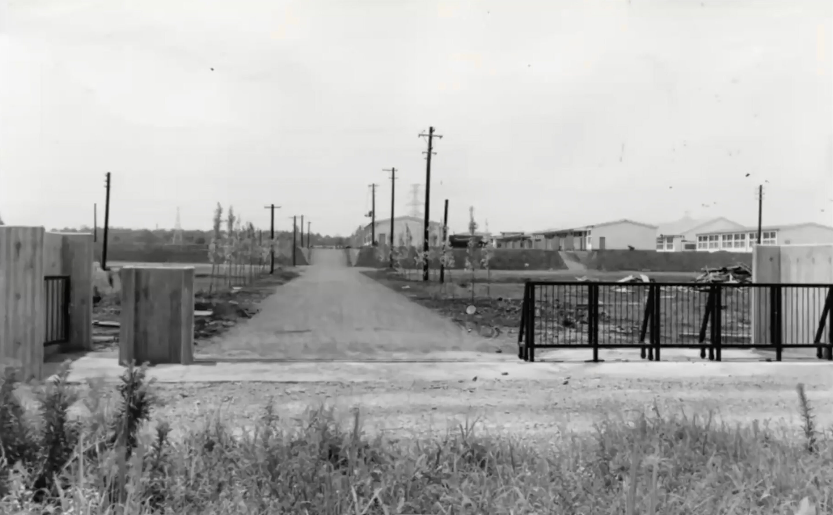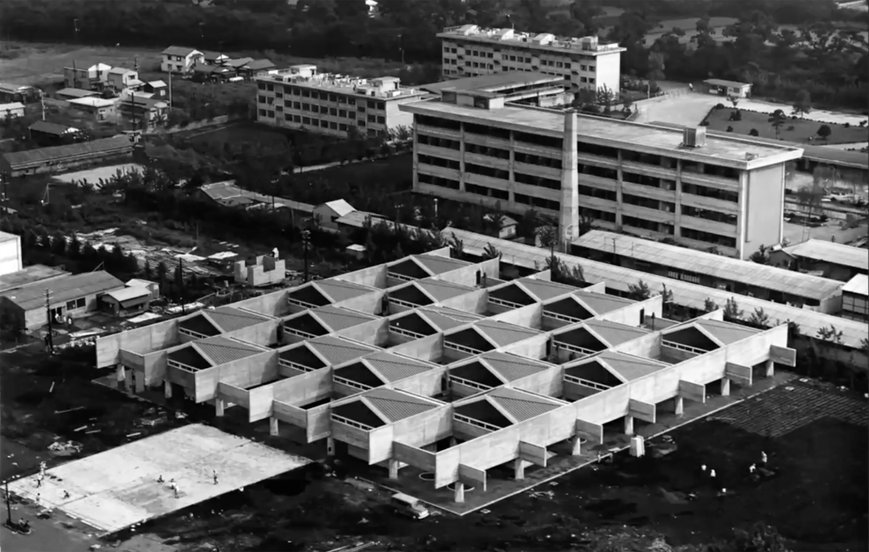 そうして正門ができあがって、キャンパスの建設がだんだん進みます。これは北側から見た4号館。4号館はできましたが、まわりに何もありません。中央広場は、たぶんまだ工事中ですね。当時の4号館には、ちょっとしたベンチがあったり、水場があったり、みんなが集まる場所がつくられていました。当時の先生方の文章を読むと、こういうところでバーベキューをやったりしたそうです。