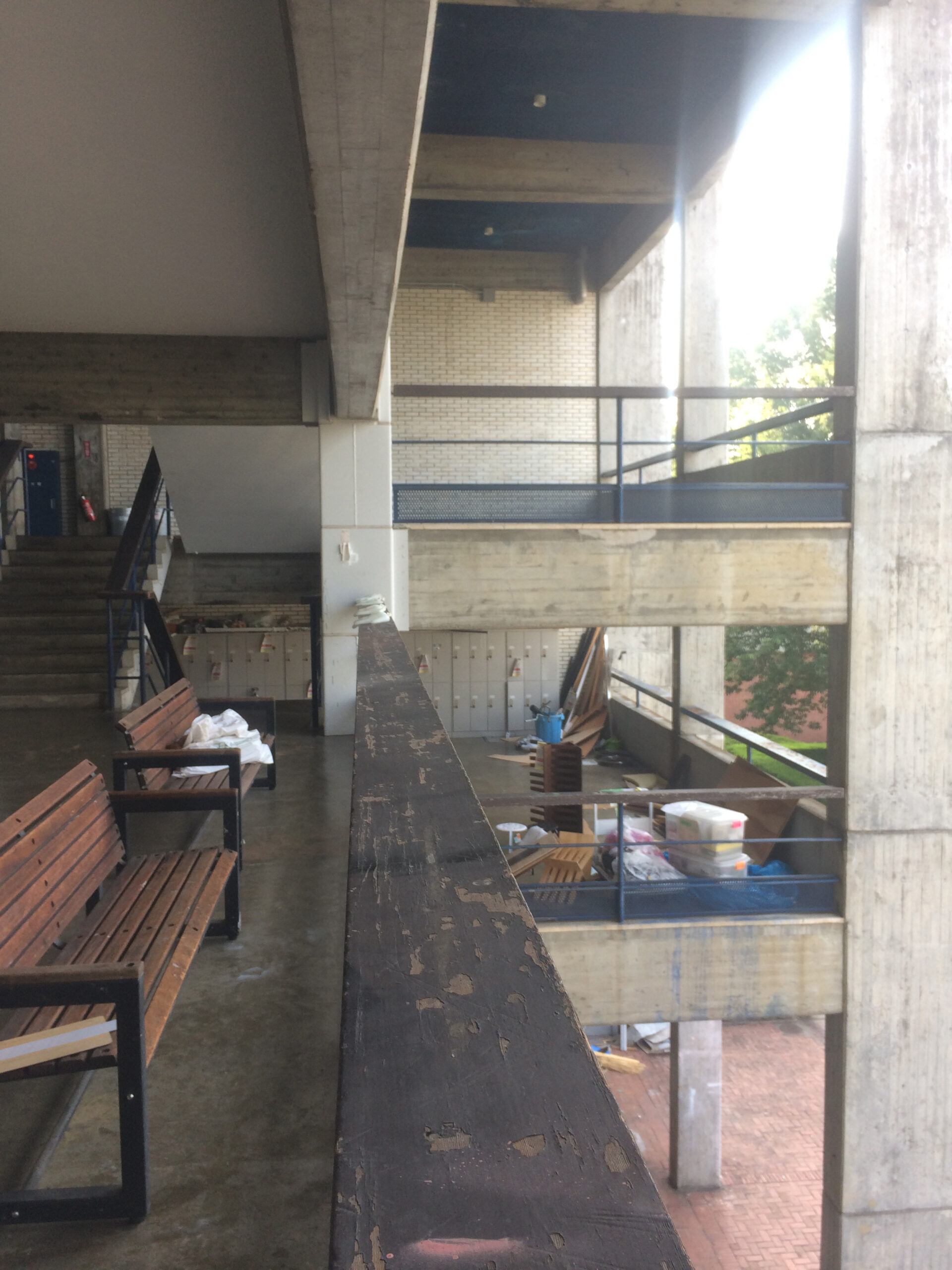 教室の外なんだけれども雨はあたらない、だけども外気とつながっている。芦原先生は公共建築だけではなく住宅もたくさん手がけておられますが、内外の繋がりだけでなく、人間が手を置いたり、腰掛けたりするような身体につながるデザインが非常に巧みですね。たとえば手すりは、幅がとても広いんです。高い建物だと危険ですが、ここにちょっと物を置いてしゃべったりとか、いろんな使い方ができるわけです。