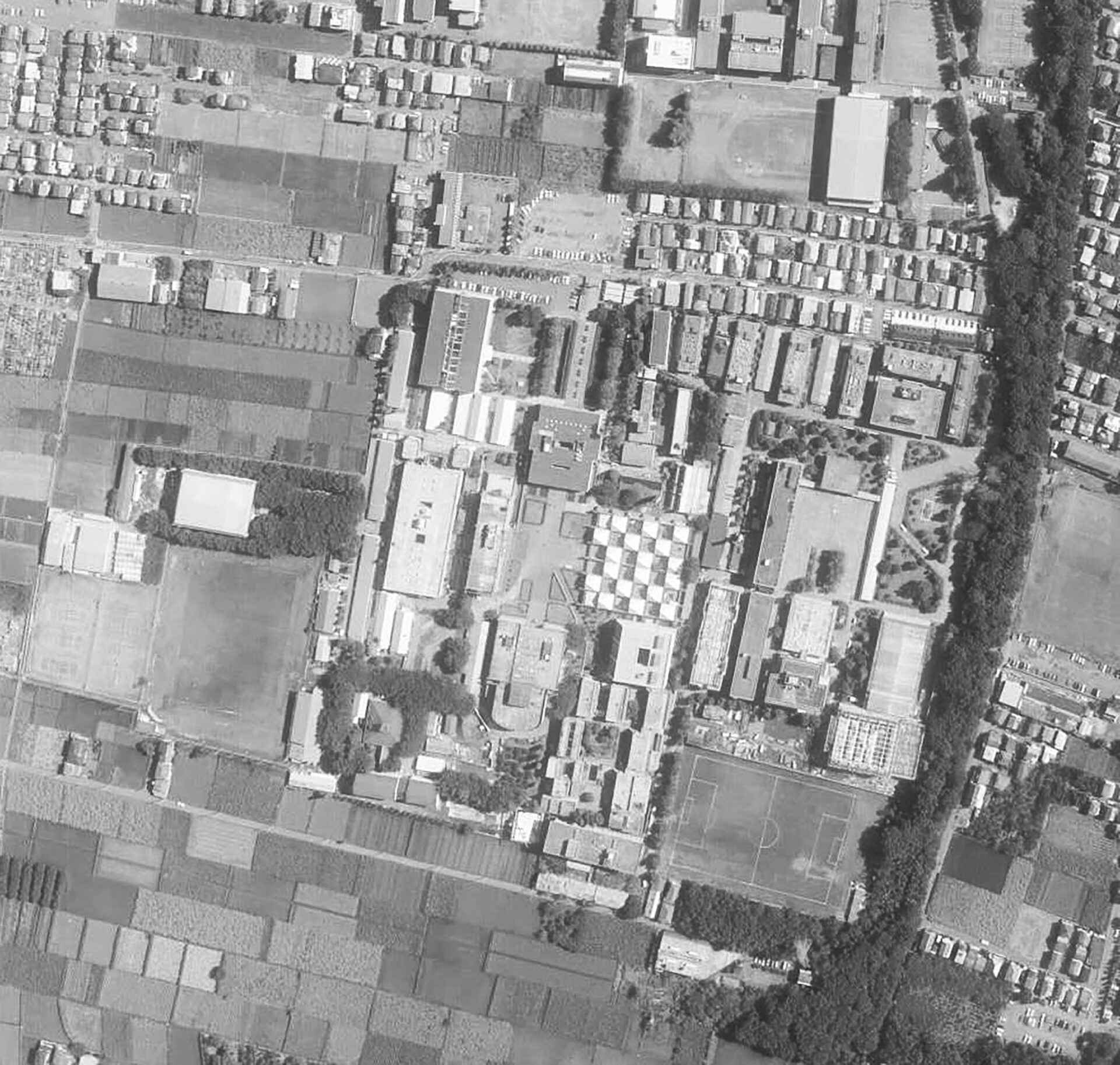 建物で遊ぶ人は、けっこういます。たとえば、明治時代につくられた日本銀行本店を上空から見ると「円」という漢字が見えるそうです。同じようなことを芦原義信はムサビでやりました。1号館が「日」、中央広場が「本」、美術館が「一」に見えるというんですね。“日本一の美術大学” という伝説です。