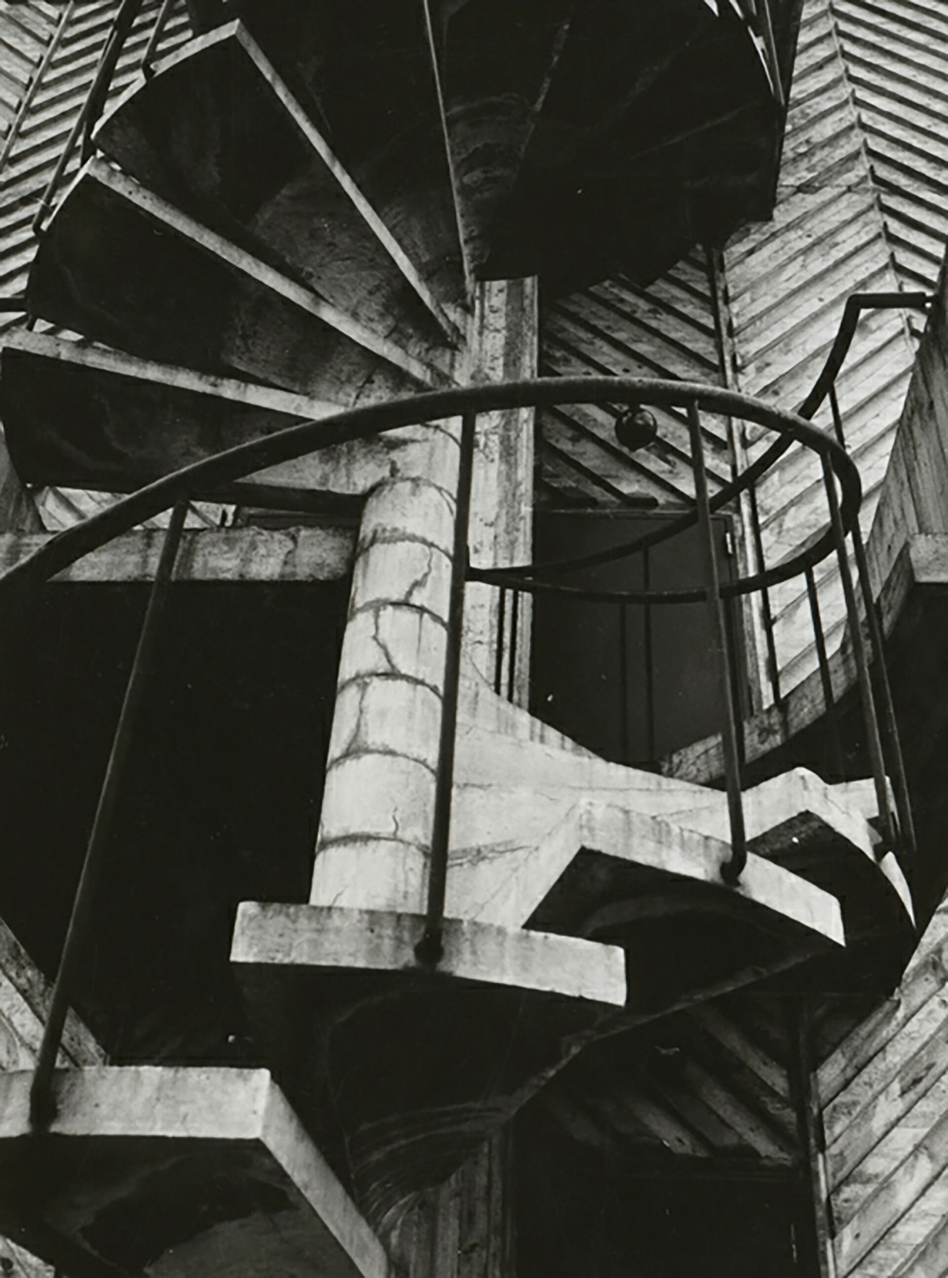 7号館の外階段は、螺旋階段になっています。この螺旋階段はちょっと変わったつくりで、プレキャスト・コンクリートといいます。工場であらかじめコンクリートを固める。そうして固めてつくったパーツを運び込んで、同じものをねじりながら重ねてつくった階段です。