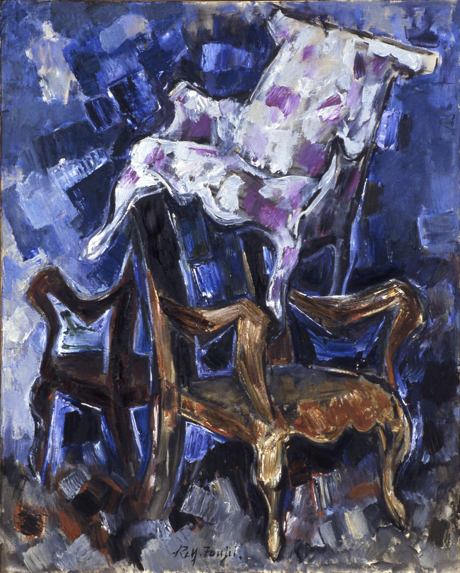 む》という作品。この人は短大美術科の先生だった方ですが、若い頃から印象深い先生でして、桜井先生にも通じるところがあるんだけど、椅子が生きもののように、踊っているような… …。すごく若い頃から気になっていた絵で、非常に芯があるんだけど、ある種の軽妙さもあるというか、決して綺麗に描こうとしていない。そして存在はあるんだけど、どこか空間と一体化していくような、そんな予感が漂っている作品で、これにはみんな注目してほしいですね。