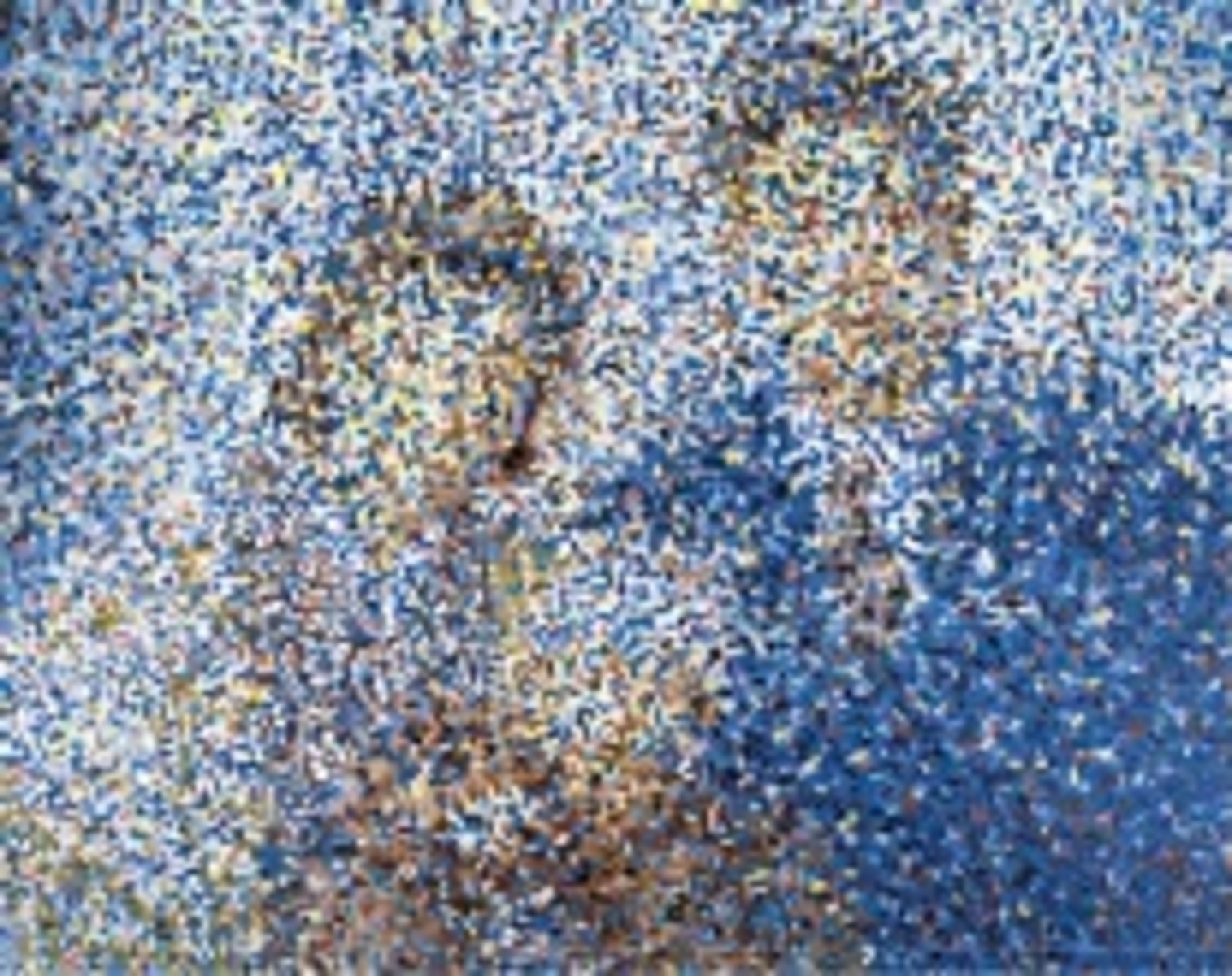41年、記念撮影》は家族の肖像写真のようなものが点で表現されている作品で、これランダムに点描してあるように見えるんだけど、薄く描いてある肖像のアウトラインにそって柔らかなタッチで濃淡が描かれているんです。その上からランダムに点描風の線が描かれているのですが、一瞥するとその濃淡の影に誘われて、その色で描いてあるように観えてくるという、 「観える」という構造を冒険的に探していかれた先生です。
