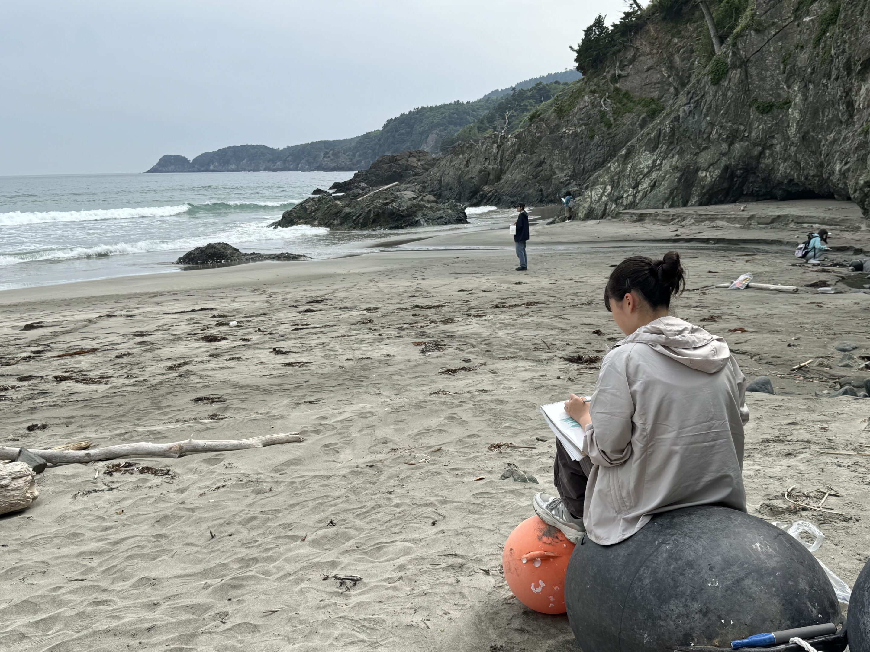 牡鹿半島の先端にのり浜という場所があり、フィールドワークでそこを訪ねました。おしか御番所公園の展望台から綺麗な三角錐として見える金華山は、のり浜から眺める金華山とは違っていて、もはやそれが金華山かどうかわからないほど近いというか、迫ってくる。