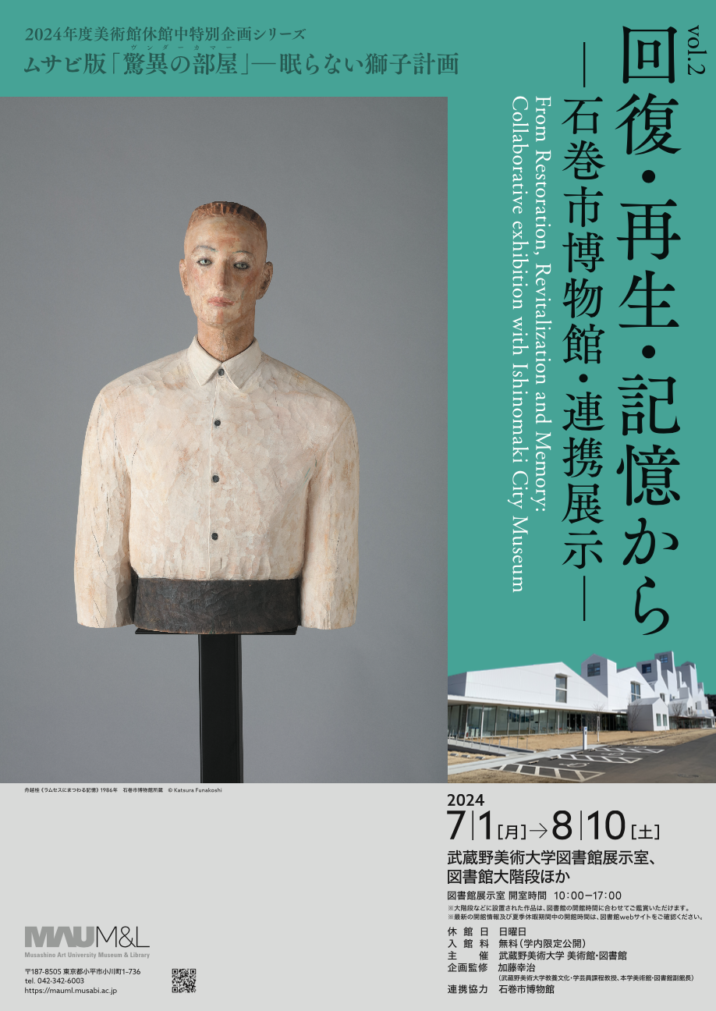 20 24年には大学美術館の大規模改修工事による休館にあたり、休館中にも学生に学内で美術作品に触れる機会を提供するために、石巻市博物館から舟越桂「ラムセスにまつわる記憶」という半身像の木彫作品をお借りして、大学図書館展示室で公開しました。