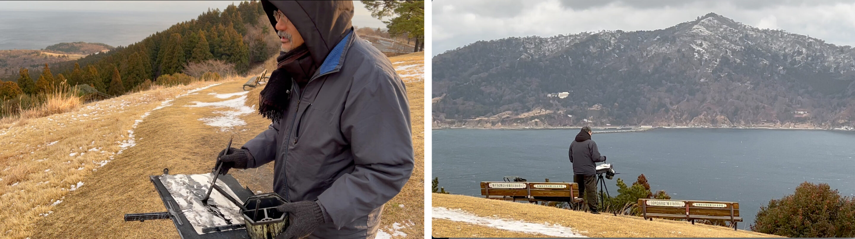 これは、一番最初に樺山先生が石巻の牡鹿半島で、極寒のなか冬の金華山と向き合われた時の写真ですが、声をかけられないような鬼気迫るものがありました。