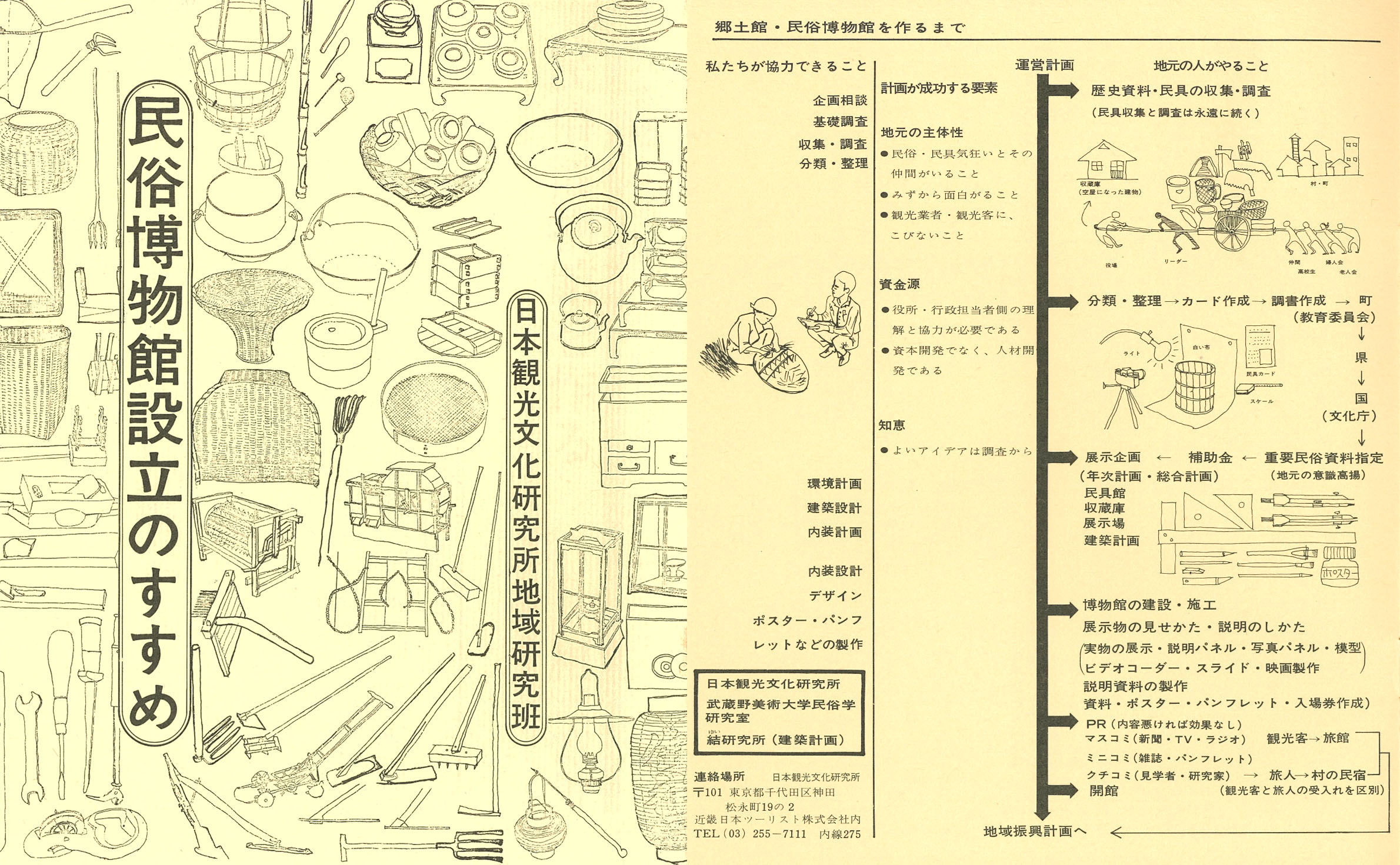 19 85年 に作成された『日 本観光文化研究所要覧』 には、 「知 的な旅の創造」 と題した挨拶文で、 観文研の活動の趣旨が述べられている。 宮本常一の旅についての遺志を継いだ当時の神崎宣武所長や 、所員・ 同人という形でそれぞれのスタンスで活動に参加した若者たちの思いが凝縮されており 、それはまた、 現在武蔵野美術大学に所蔵されている民具コレクションの思想とも言える。
