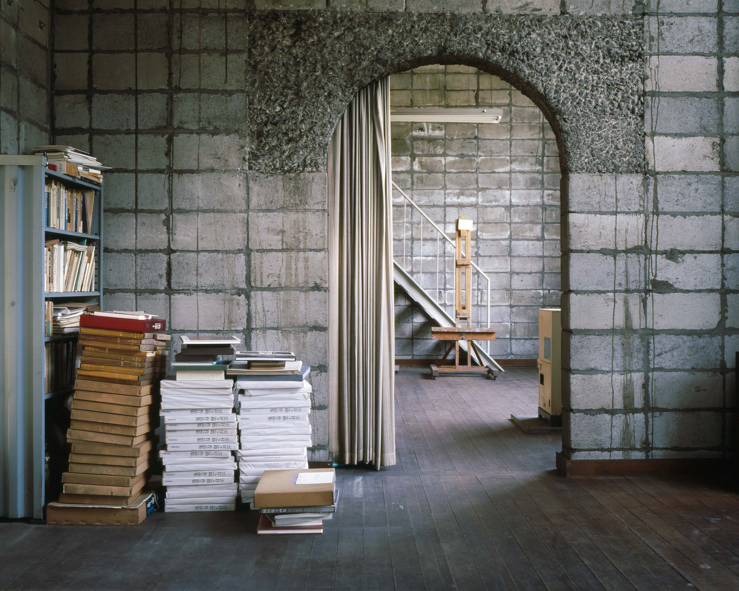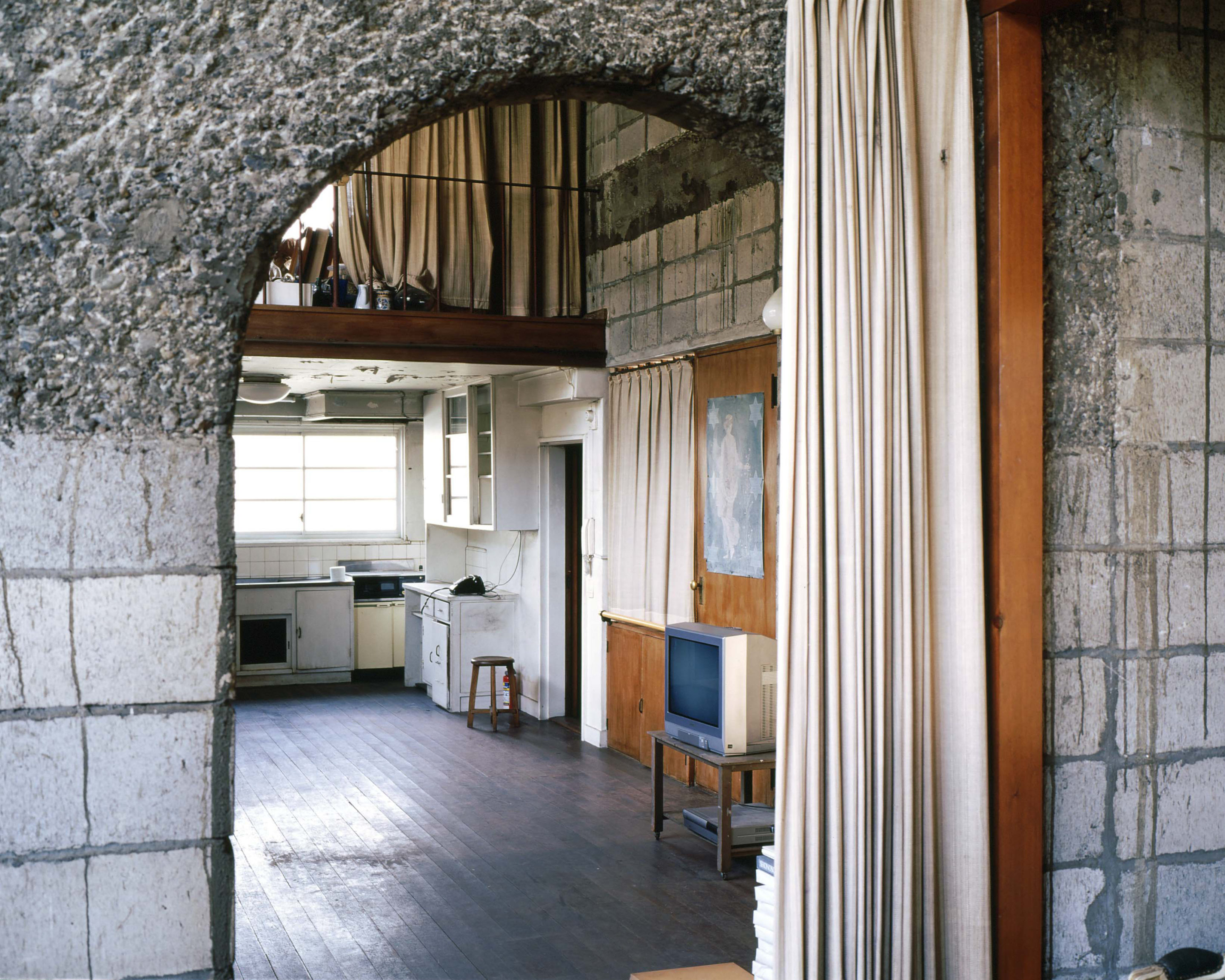 アトリエに入って目にした壁は衝撃だった。ブロックとブロックの間の目地の荒さが尋常ではなく、とても室内の仕上げとは思えなかった。近所のブロック塀の方がずっときれいだと感じた。ブロックを積む際に当時の学生たちが手伝ったという逸話を信じるに値する素人の手の痕だった。夫妻がこの荒いテクスチャーを許容したのも、目地が学生たちの手の痕だとすると理解できる。壁は建設時の出来事を記憶しているのだ。