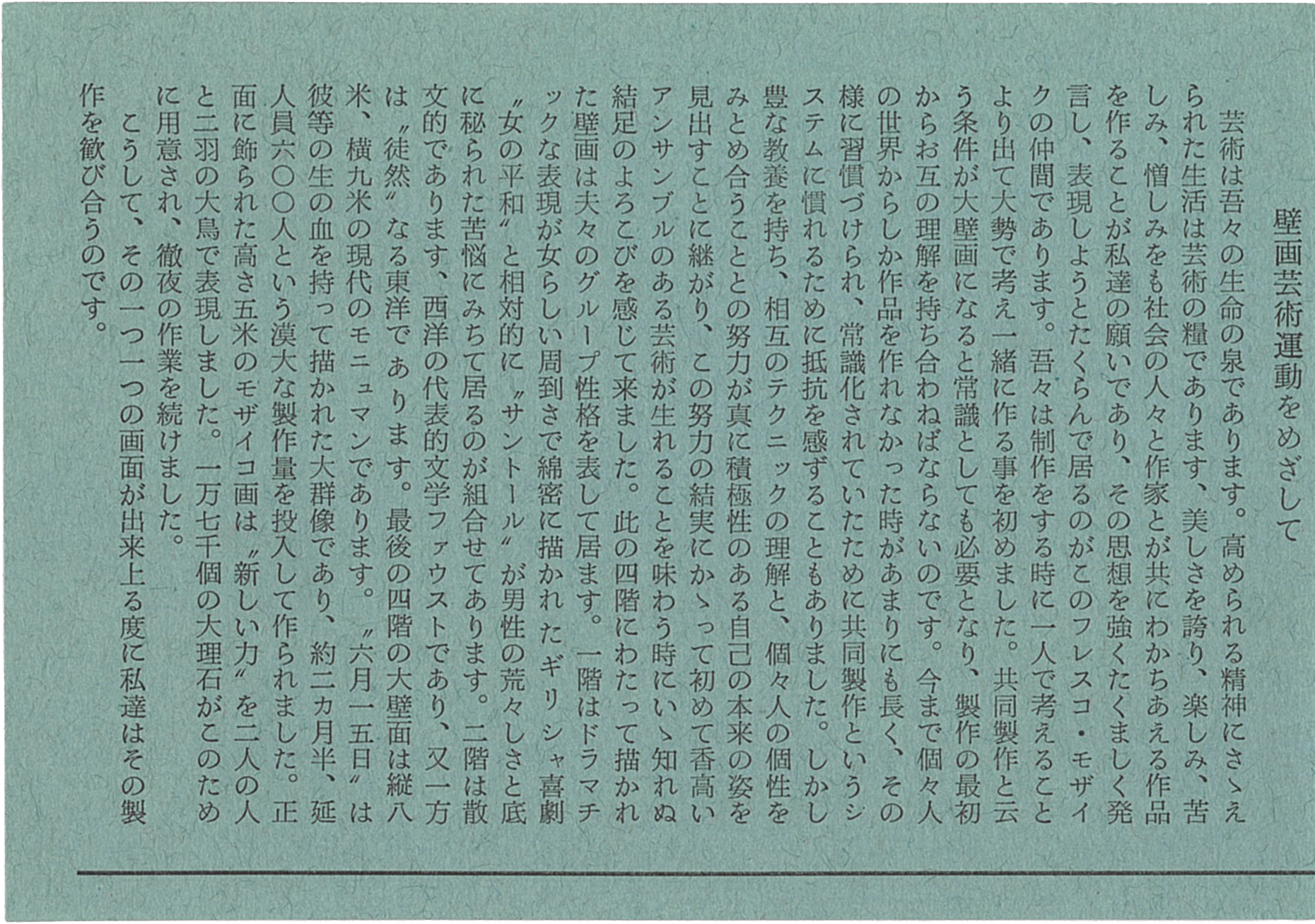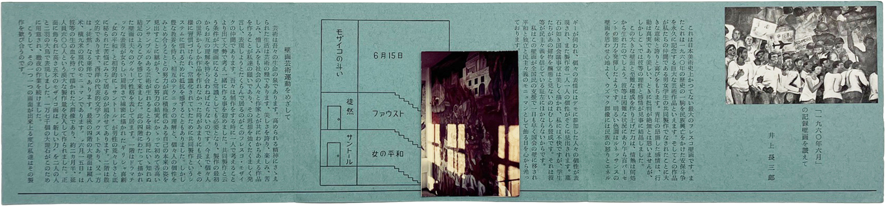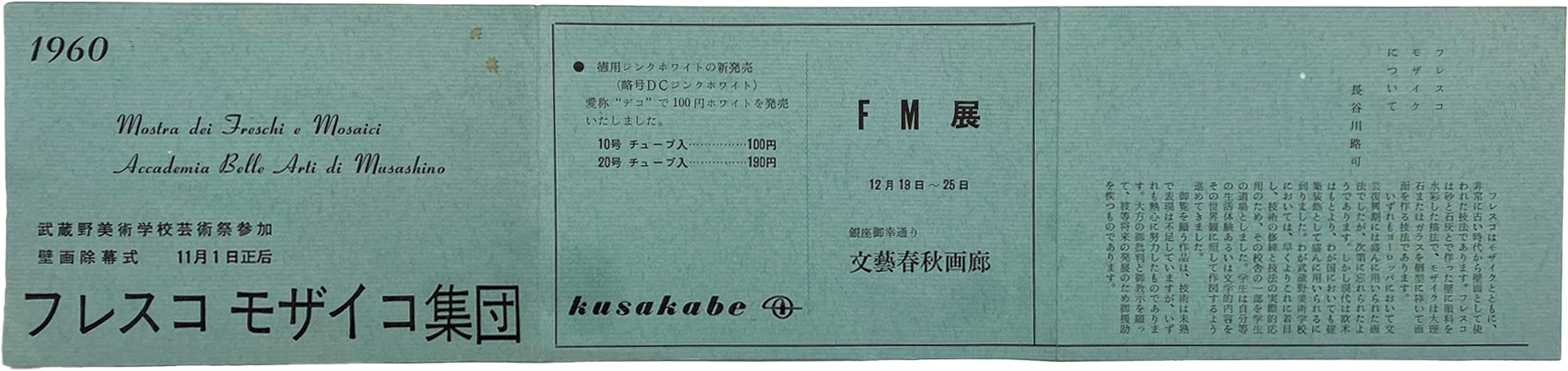 今、私の手元には1960年にF・Mクラブが作成した案内状が1枚ある。私が、ムサビのモザイク画教育に関心を持ったことでF・Mクラブの存在を知り、その中心的存在であった宮内先生のお宅にお話を聞きに行ったときにお借りしたものだ。その年の芸術祭のために作られたものなのだろうか。表紙には「1960 武蔵野美術学校芸術祭参加 壁画除幕式 11月1日正午」とある。三つ折りになった葉書サイズのそれは、開くと右側に洋画家で当時教授であった井上長三郎註2による壁画を讃える賛辞があり、真ん中に当時の吉祥寺校舎2号館の1階から4階までの見取り図、左側にF・Mクラブの誰かが書いた挨拶文があった。私が驚いたのは、真ん中の校舎の見取り図には各階にタイトルが書かれていて、つまりひとつの校舎全館をフレスコ画やモザイク画で埋めつくしていることだった。