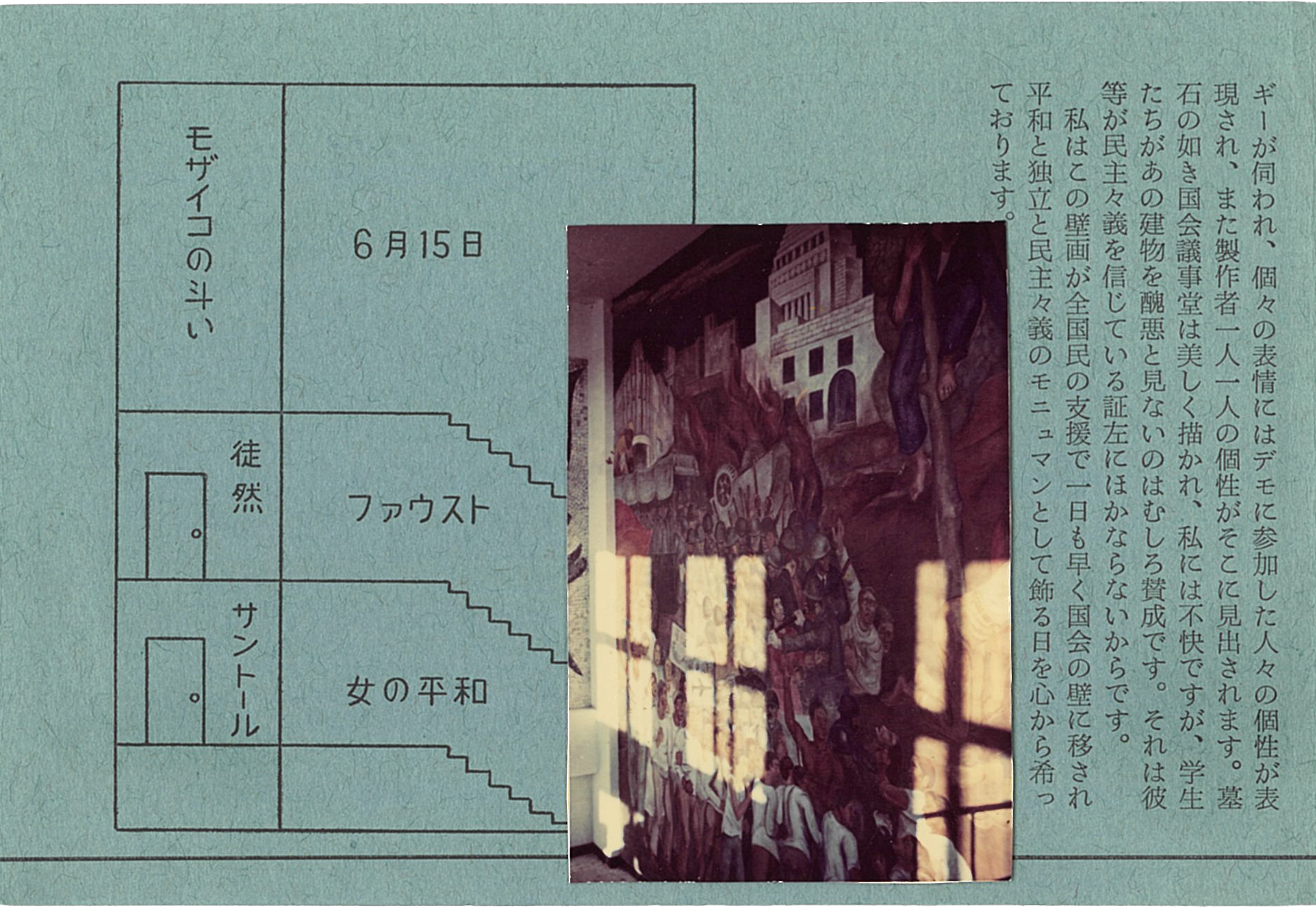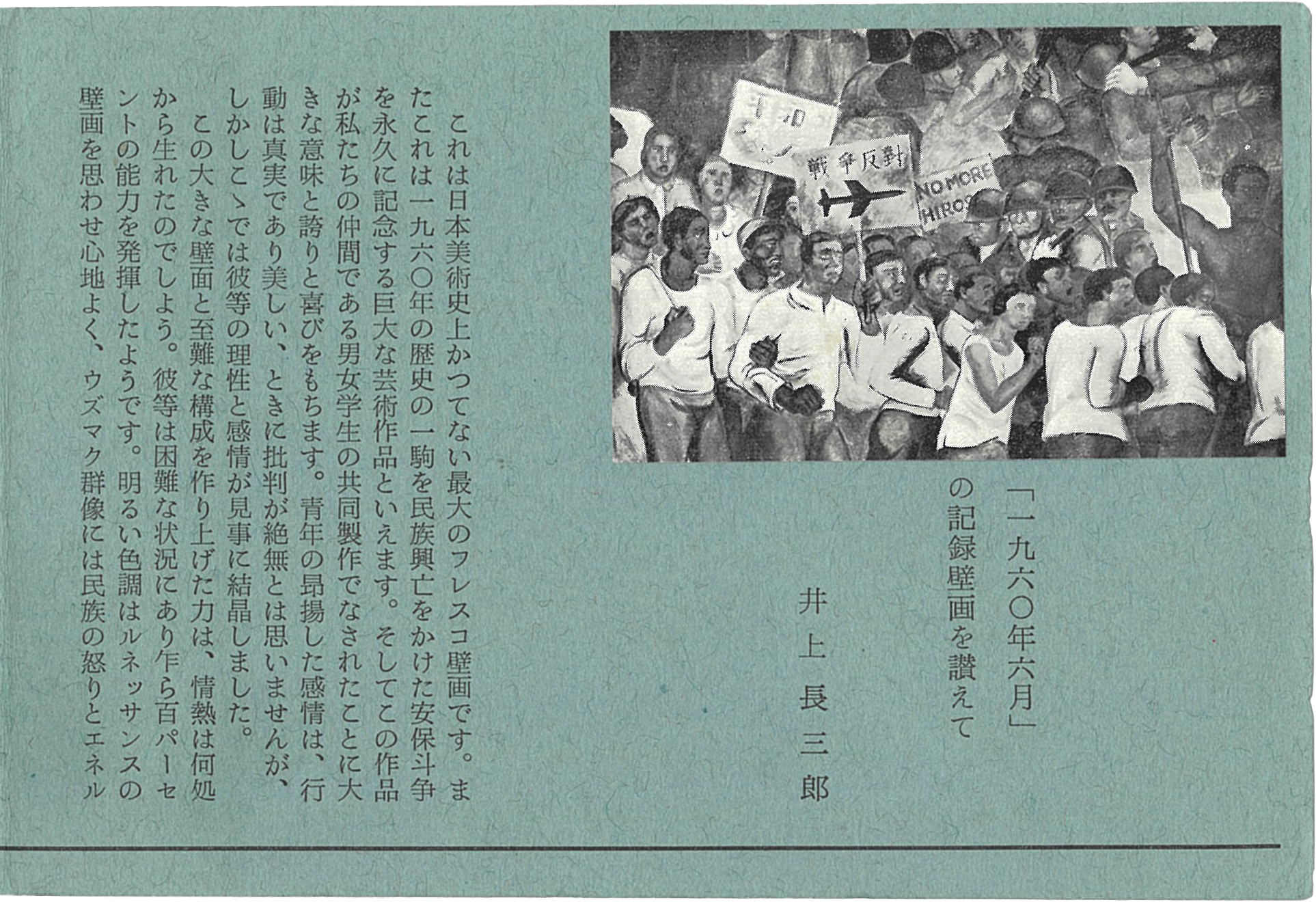 私は、この事実にちょっと鳥肌の立つ思いだった。調べてみると1960年の6月15日は、学生を中心にした民衆が日米安保条約を成立させまいと国会議事堂になだれ込んでいった日であり、その騒乱の中で東大の女子学生が圧死している。平和を願い、権力を嫌い、国会までの道のりを埋め尽くした若者たち。宮内先生が案内状に貼ったのであろう小さな白黒写真には部分しか写っていないのでフレスコ画の全容はわからないが、それでもそこに描かれたヘルメットを被ってプラカードを持つ数十人の姿はそれぞれが真剣で、胸を打たれるものがある。6月15日からムサビの芸術祭の11月1日まではわずか4カ月余りしかない。準備やその他を考えると制作期間は3カ月もなかったのではないか。学校も学校で、よく学生を信頼して、校舎の壁を壁画で埋めることを許したものだと、当時の学生にも学校にも頭が下がる思いがするのであった。