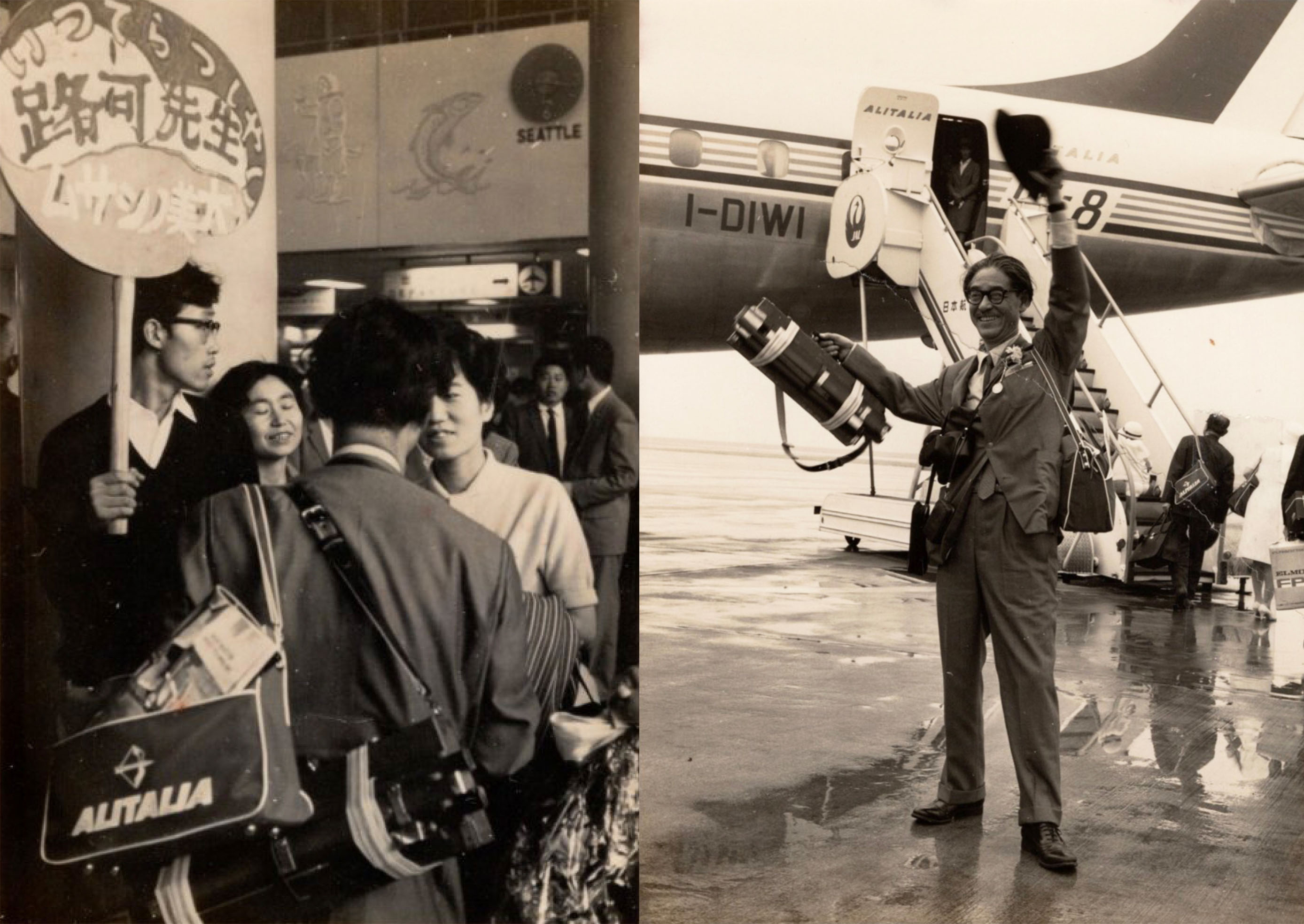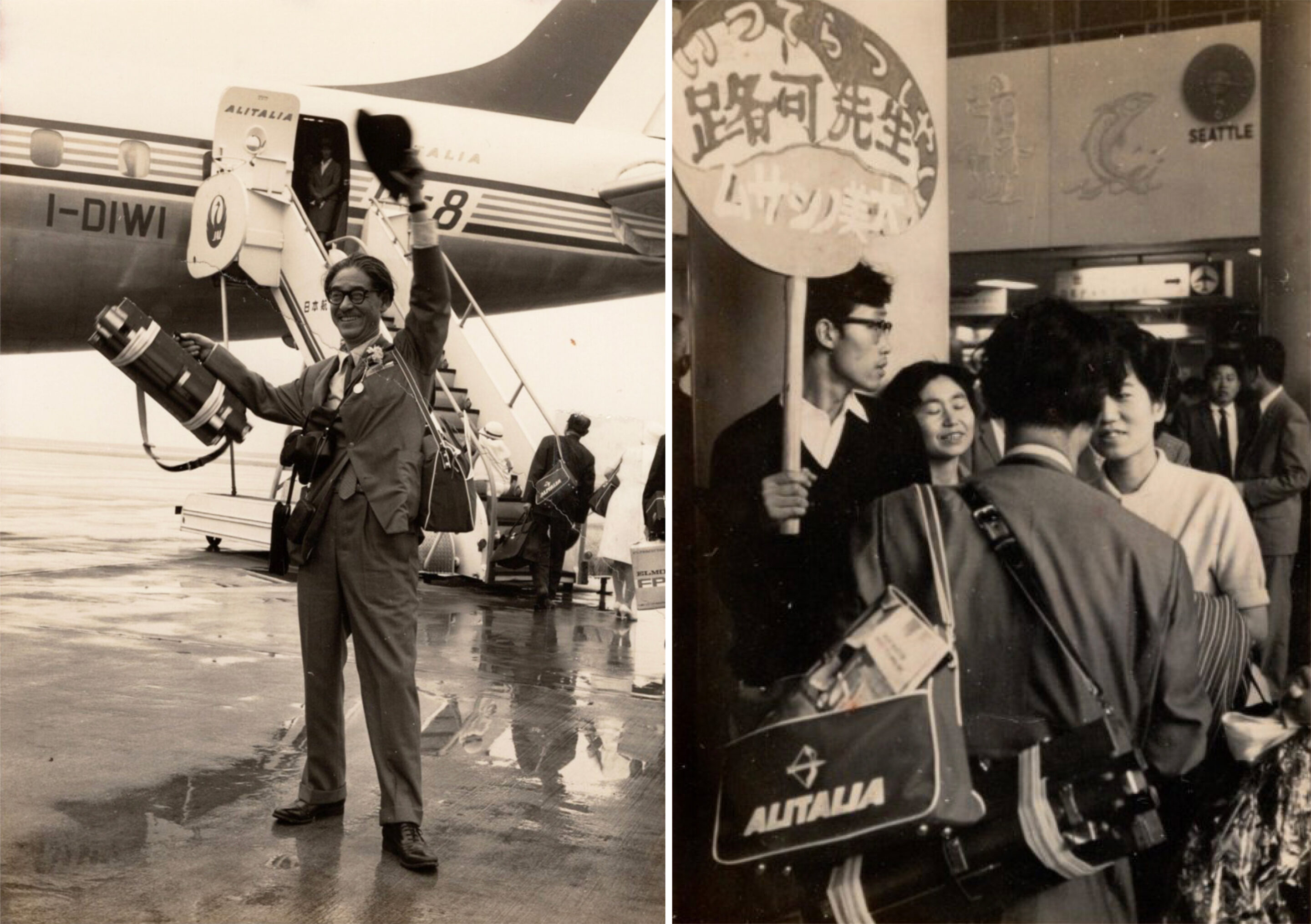 1962年、羽田空港にて。イタリアヘ出発する長谷川路可(左)と見送りに集まったムサビの学生たち(右、手前の後ろ姿は長谷川)。プラカードを持っているのが学生時代の宮内淳吉(画像提供:長谷川路可のご子息・長谷川路夫氏)