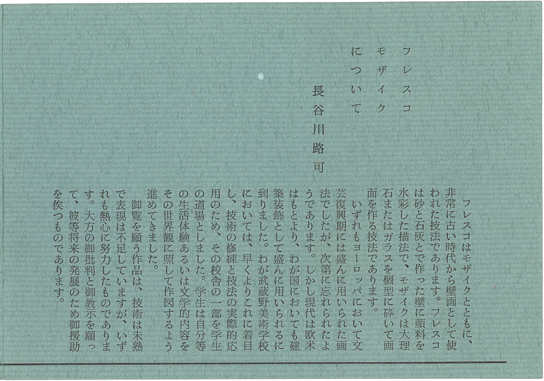 長谷川が売れっ子のフレスコ・モザイク画の作家であったのはもちろんであるが、同時にデザインとファインの間にある場所、建築と美術の間にある場所、その重要性と面白さを学生たちに教え、その魅力ある分野を学生たちと分かち合いながら実践した特異な教育者でもあったのである。創立して30年も経たない美術学校を新田に例えるとして、デザインの田とファインアートの田を分ける畦道があるとしたら、彼はその畦道を口笛でも吹きながら颯爽と歩いた人なのではないか。西洋画科の学生であった宮内先生と40も歳の離れた長谷川路可との出会い。草創期のムサビの教師陣の中で、分野を超えた立ち居振る舞いをした長谷川の人柄を思い浮かべた私は、頭の中でイメージするのと一緒に、先に挙げたようないくつかの漢字を思わずつぶやいてしまったのだろうと思うのだ。