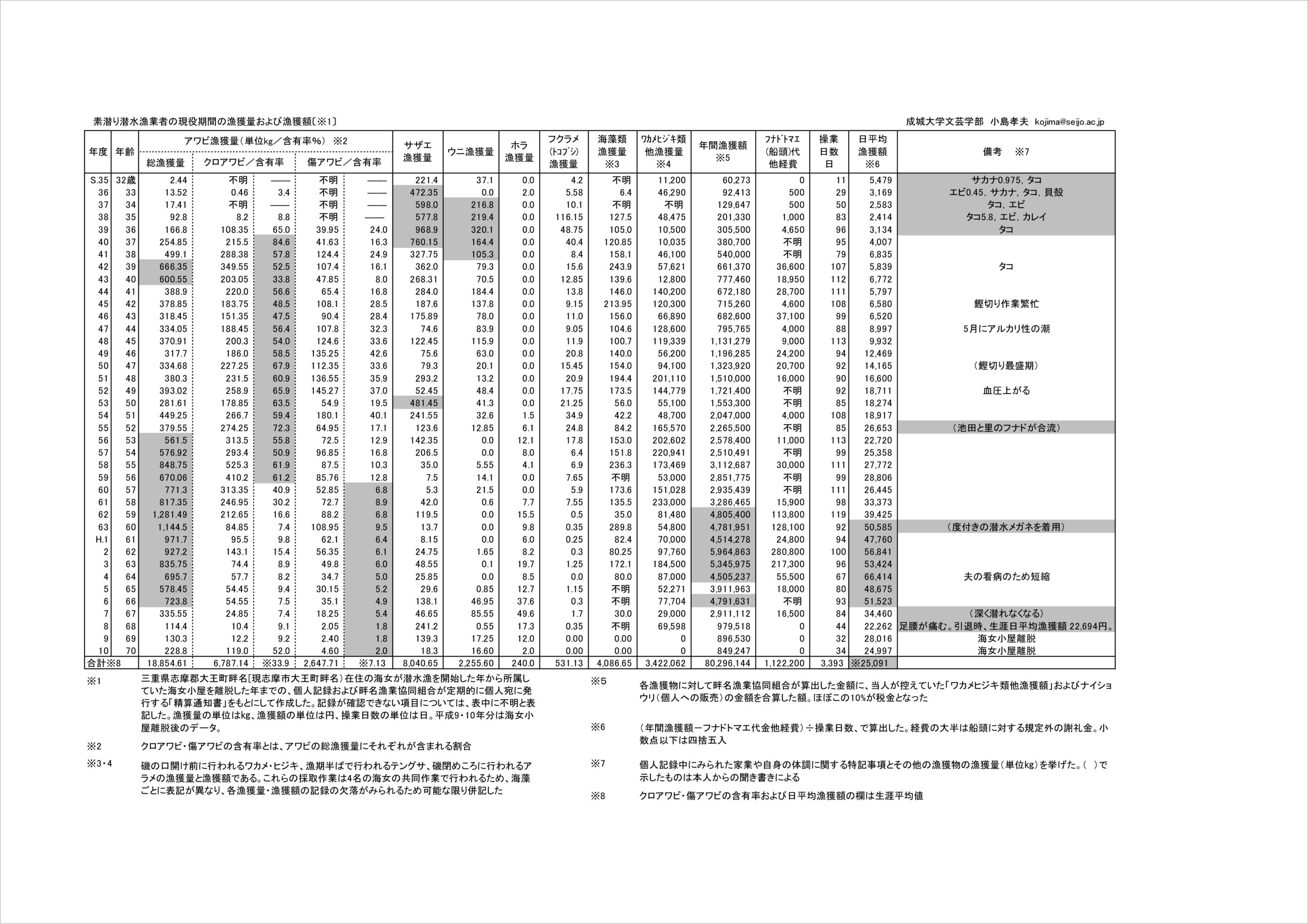 小島孝夫「素潜り潜水漁業者の現役期間の漁獲量および漁獲額」1960–1998年(調査報告)
