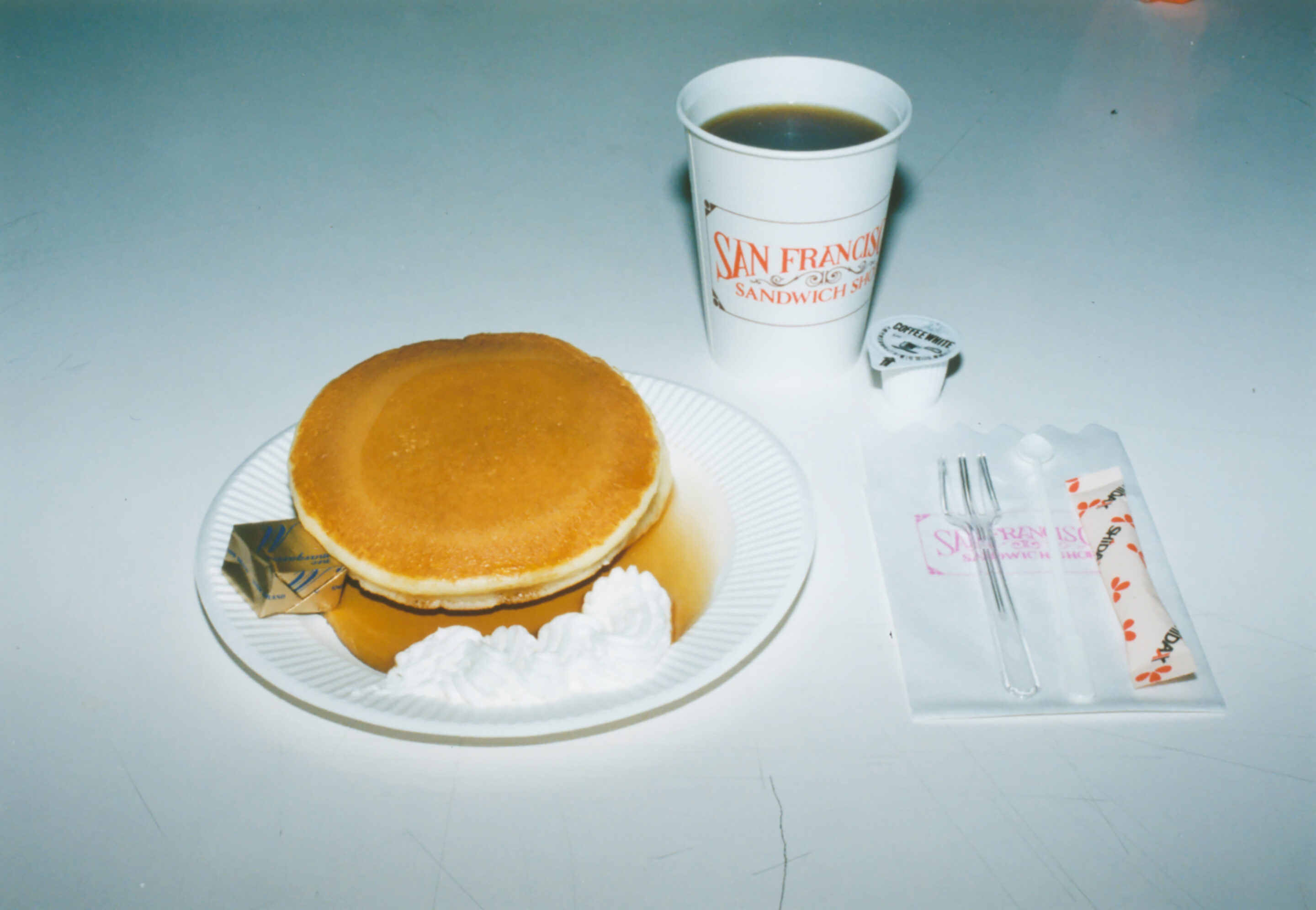 ホットケーキは厚さ5 mmぐらいで、レンジでチンされたものだからお世辞にも焼き立てフワフワなんてもんじゃないけど、今でもメープルシロップとバターをたっぷり塗って生クリープをのせた、このホットケーキセットが無性に食べたくなる時があります。