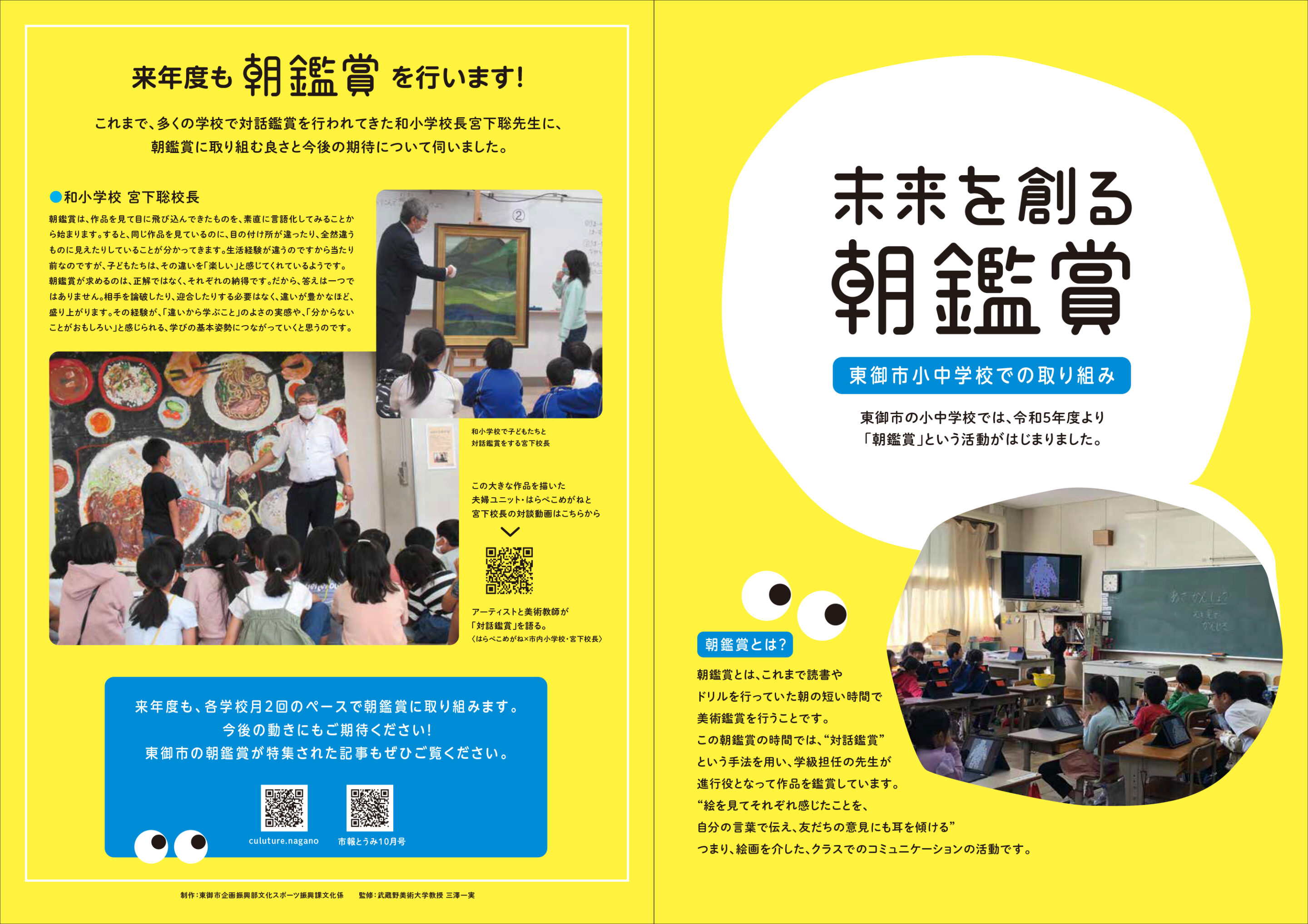 現在、行政にも協力していただき、長野県東御市の市内全小中学校で朝鑑賞に取り組み、その成果を検証する社会実験を行っている。そして、この取り組みは長野県教育委員会を動かし、県内のすべての教員が受ける研修に対話鑑賞を取り入れることにもつながった。この取り組みを全国に広げていきたい。