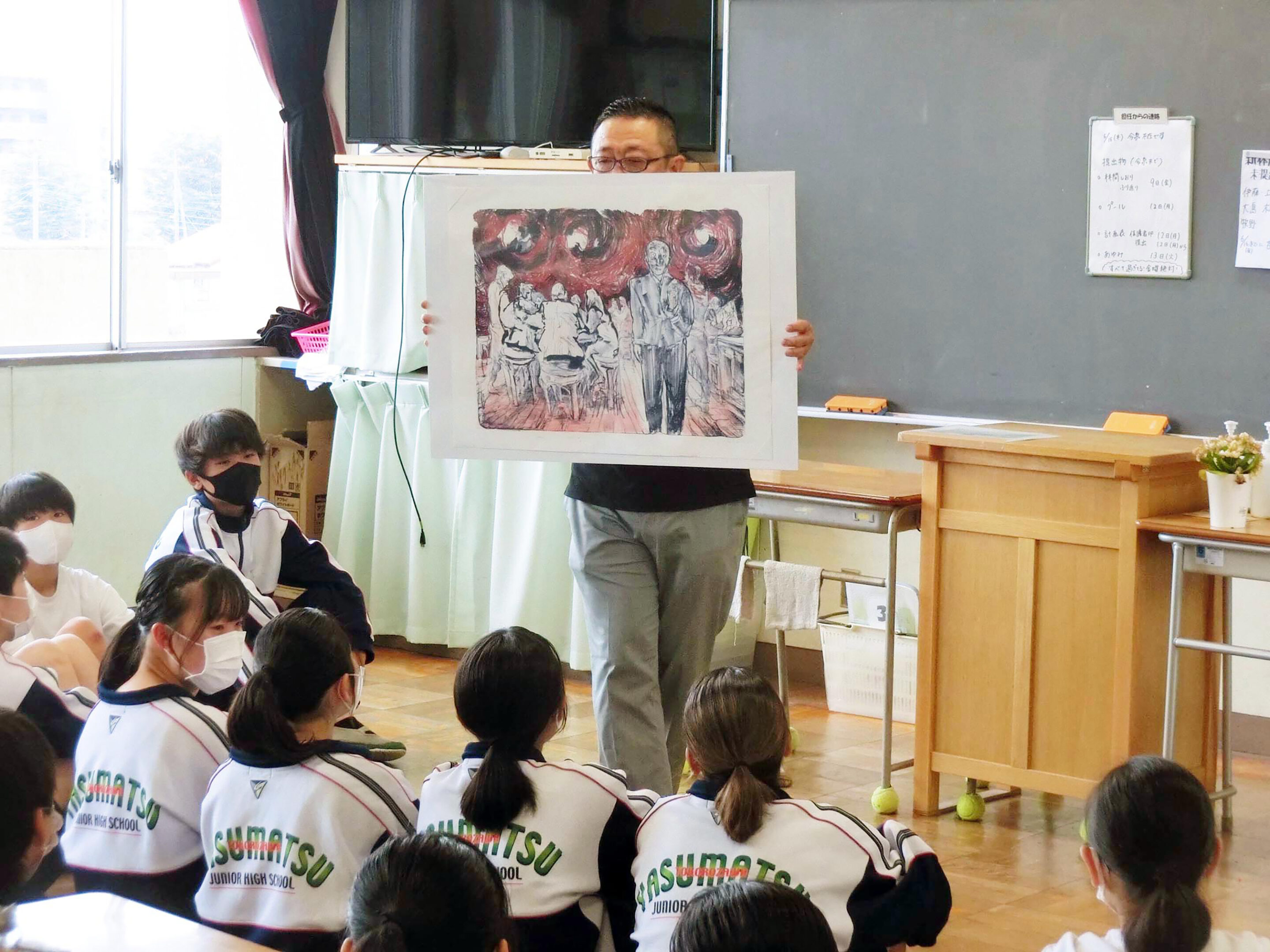 子どもたちに実物を見せたいという思いは、教職課程の学生が自らの作品を持参することで実現した。学生にとっても中学校現場を見る機会になるのでWin-Winの関係になる。実際に学生にとって学びの多い機会となった。そして、この、学生が自作品を持って各学校を訪ね、鑑賞授業に参加する取り組みを「旅するムサビプロジェクト」と命名し、美術教員のメーリングリストに流してみた。すると早速3校からオファーがきた。初年度はこの3校から始まり、今まで訪れた学校は600校を超えている。プロジェクトを始めてから何年かして、学生のアイデアから生まれた「黒板ジャック」が旅ムサに加わった。