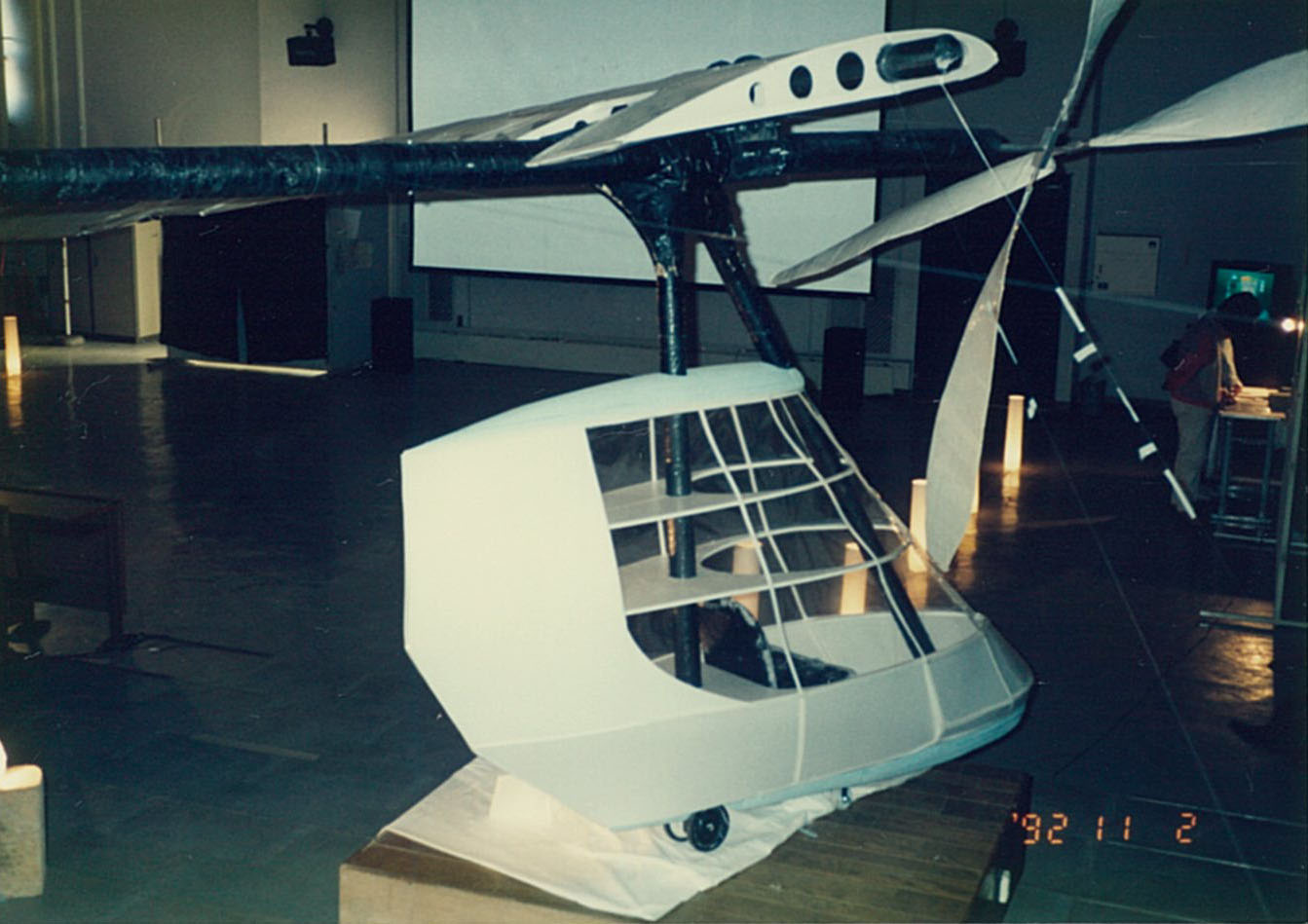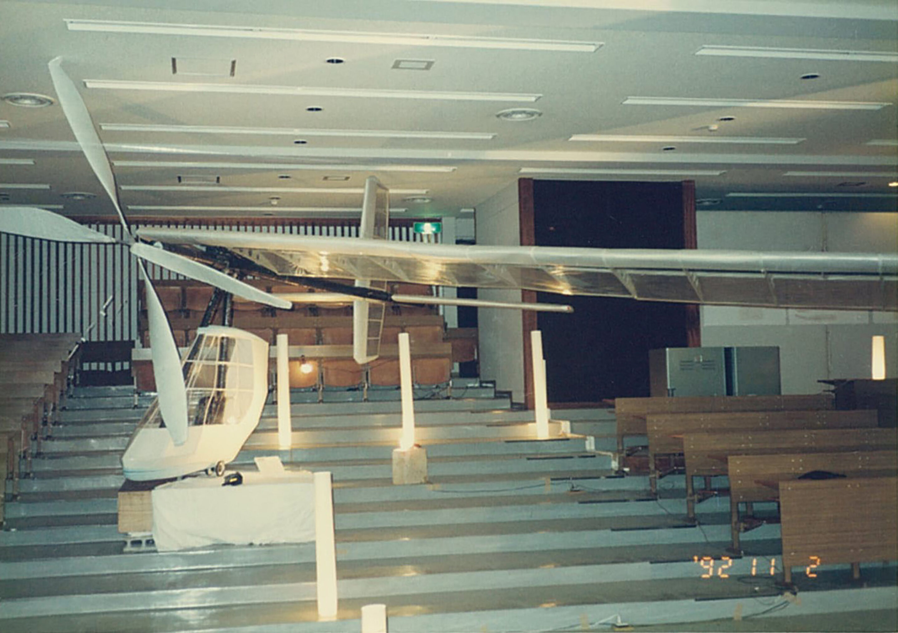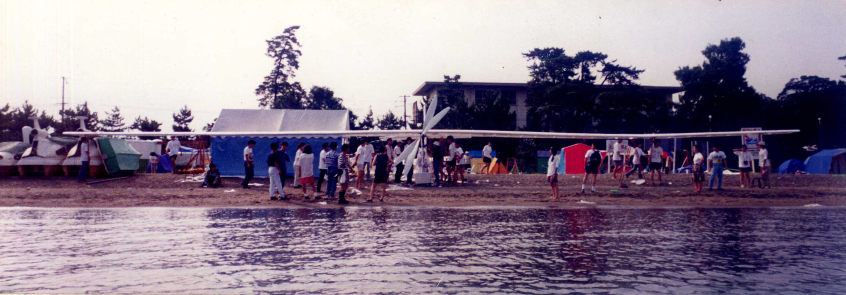 19 92年 8月、 競争率約5倍の設計審査を通過し、 完成した飛行機は、 「鳥 人間コンテスト」 で飛ばし、 テレビでも放映されました。 機体は綺麗には完成しましたが 、結果は散々 で、 記録は5.60メー トルに終わりました。