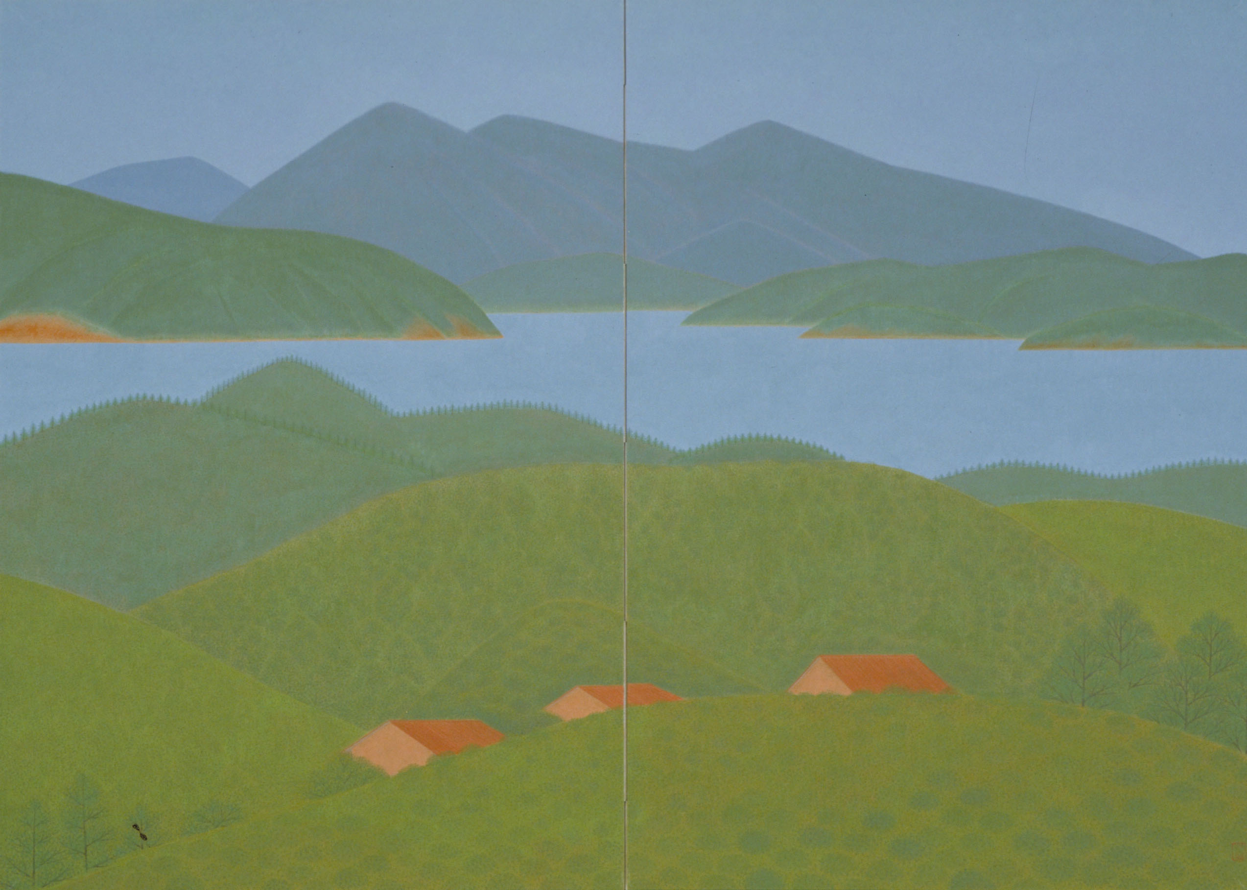 塩出先生の作品には風景画が多かったのですが、まるで契りのように、山や海、湖をありのままに受け入れていました。何度かスケッチに同行させていただいたのですが、淡々と一木一草をすべてそのまま描くんですね。変にアレンジしたりしないんですよ。全部を受け入れながらそれを簡略化した形で描いていって、絵が成り立っていくんです。