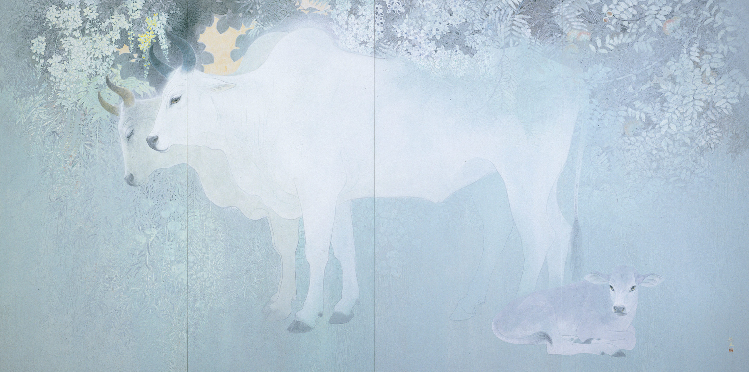 西田俊英《聖宿》2004年 郷さくら美術館蔵/ふたりの師を親牛、自分自身を子牛として描いた作品。