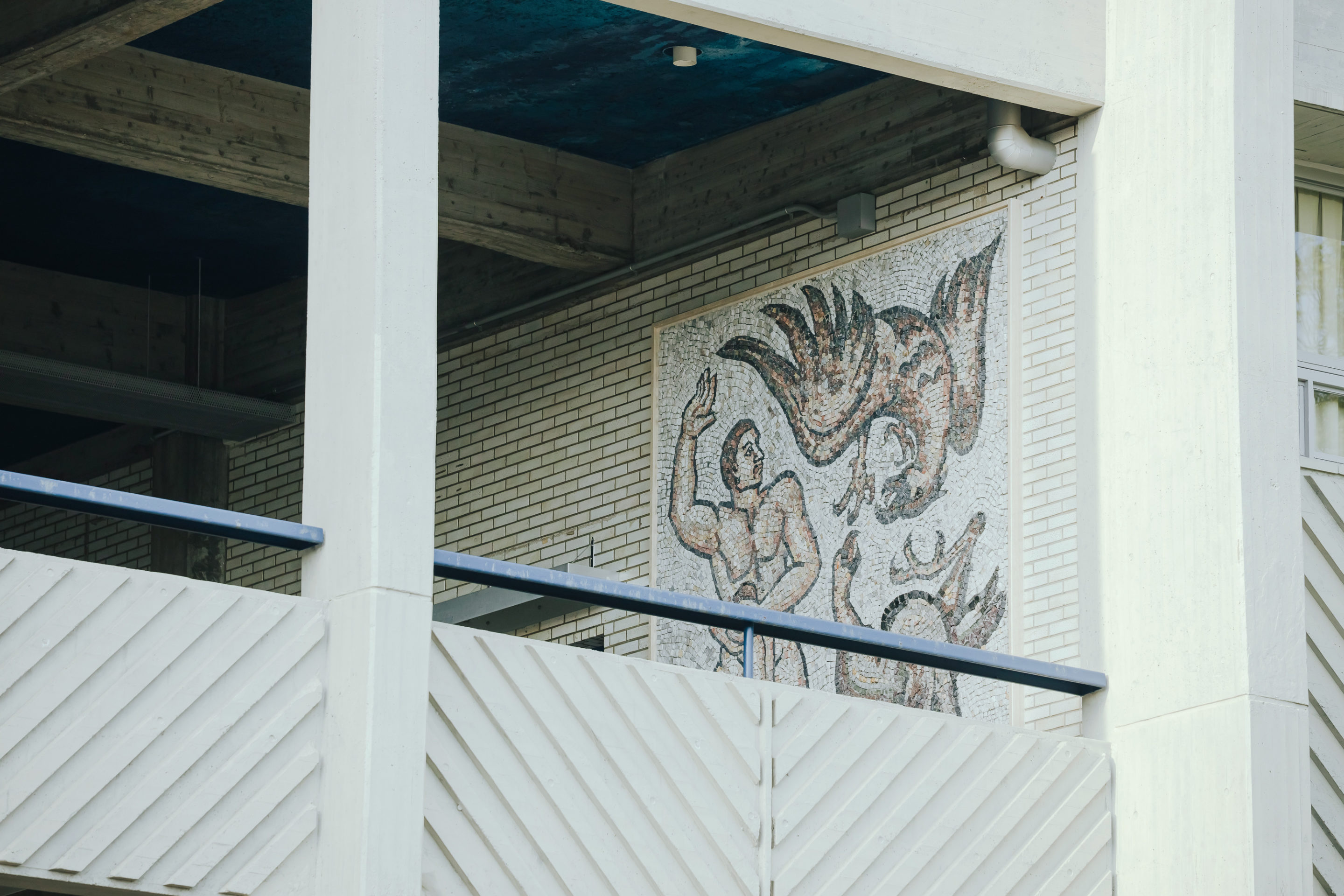 吉祥寺校ではこの壁画は建物の4階にあって、夜になって灯りがつくと、住宅街のなかでとてもきれいに見えていたそうです。いま鷹の台キャンパスに通っている学生たちのほとんどは、吉祥寺校にあった壁画を見たことがありません。移設先の7号館の4階壁面は、中央広場に面して開放感があり、とてもいい場所です。学生たちは「いつの間にこんなものが」と思っているかもしれませんが、ムサビは吉祥寺校から始まり、その歴史を経ていまの鷹の台キャンパスがあるわけなので、吉祥寺校の面影ともいえるモザイク壁画を移設し残していくことは意義深いと思っています。