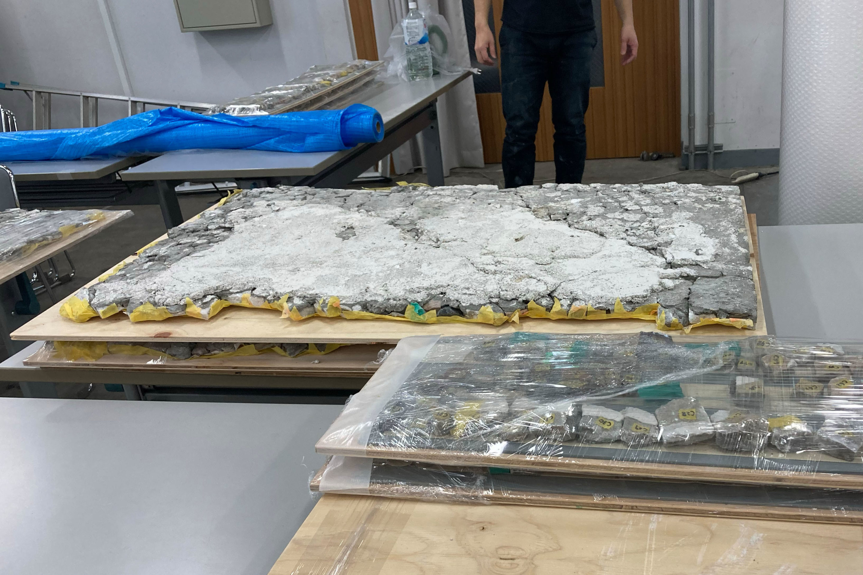 壁から剥がした石片は、配置を確認しながらモルタルで隙間を埋めてブロックごとに移設用パネルに移していきます。作業としてはこれがいちばん手間のかかる工程だったと思います。
