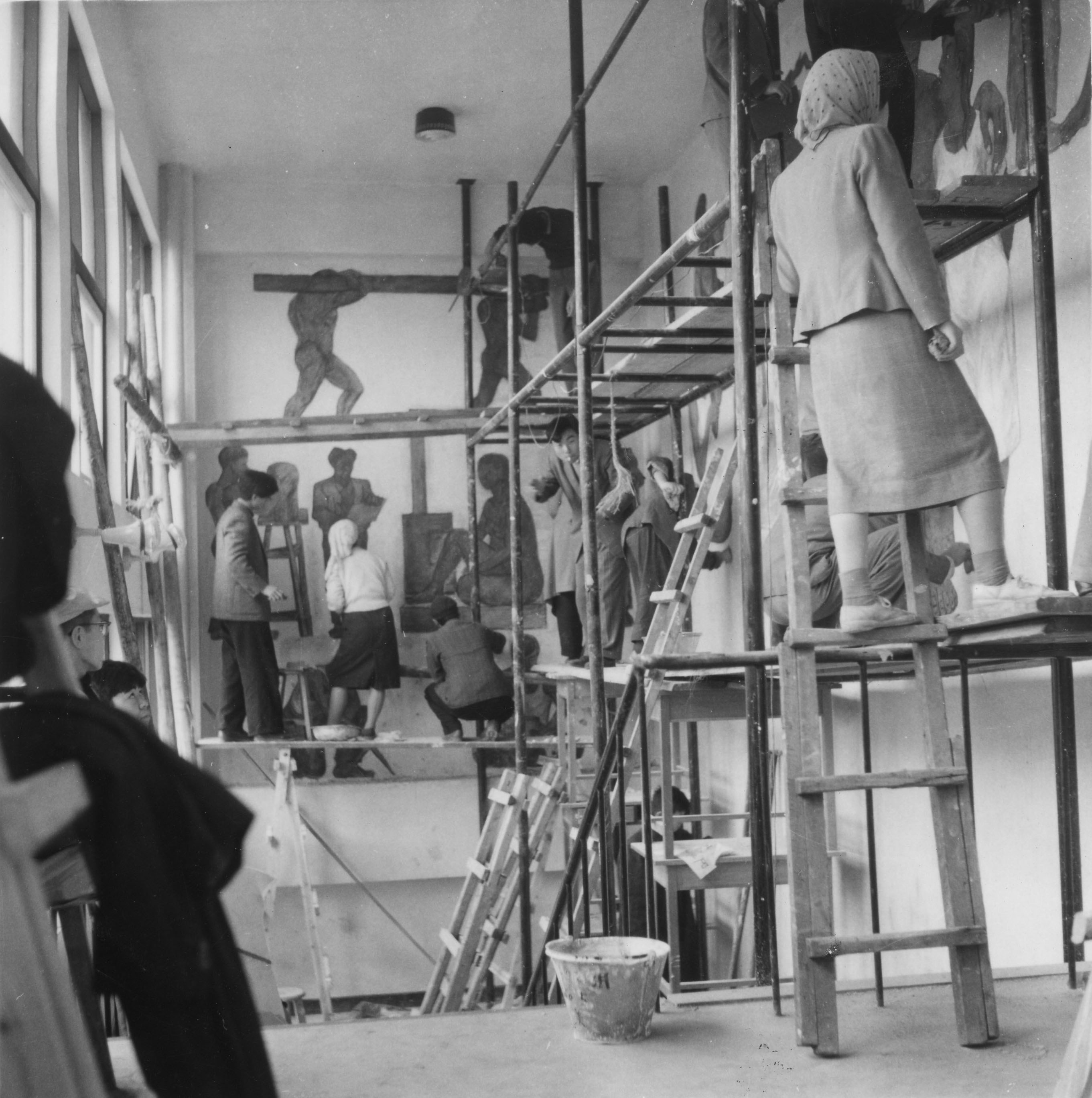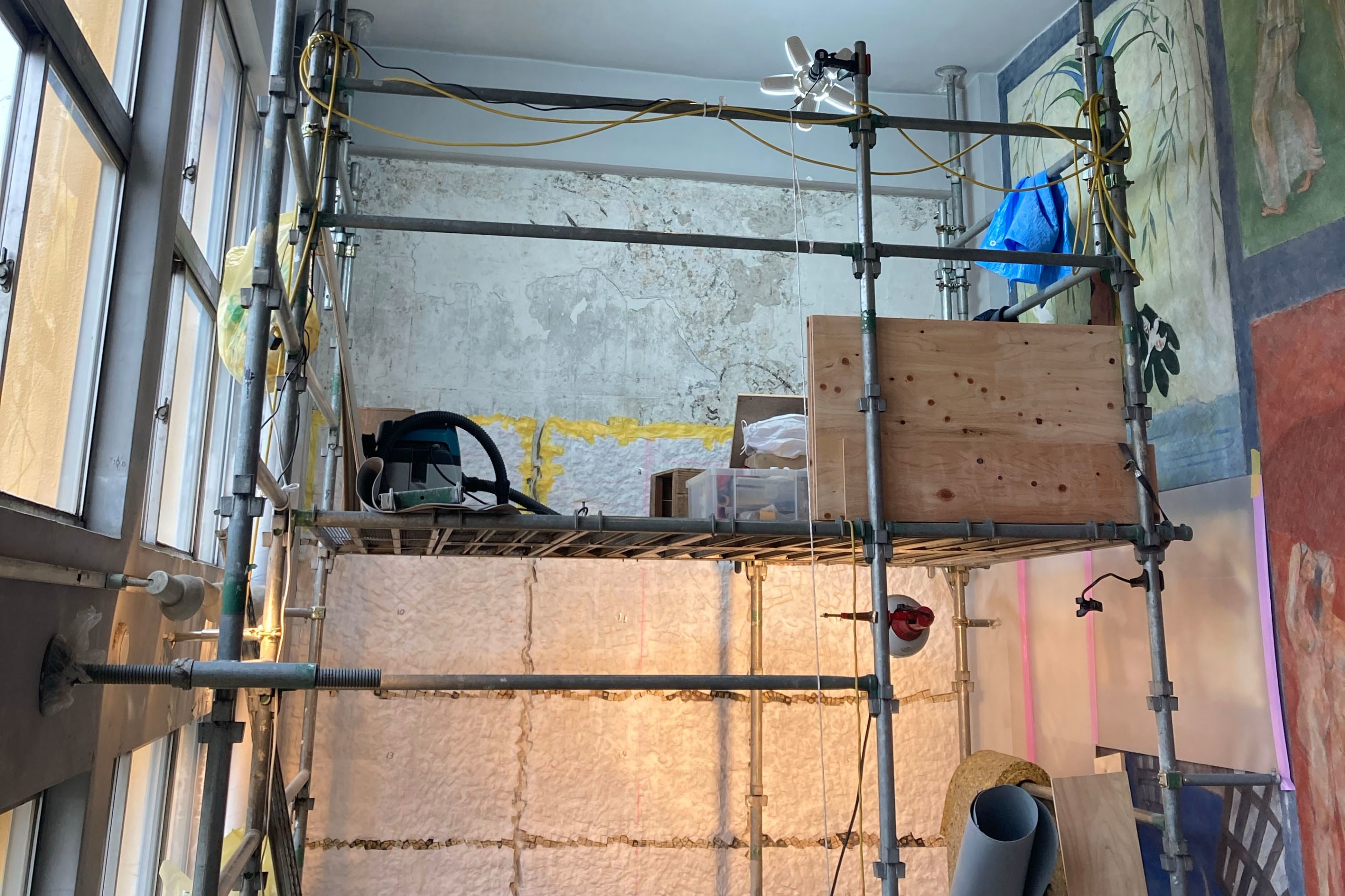 前述のように、吉祥寺校のモザイク壁画やフレスコ画の制作の経緯や詳細は不明のままですが、おそらく永久的に残すものとして制作したというよりも、実習や卒業制作のようなかたちで前の作品を剥がしてまたその上に作品をつくる、ということをしていたのではないかなと推測しています。