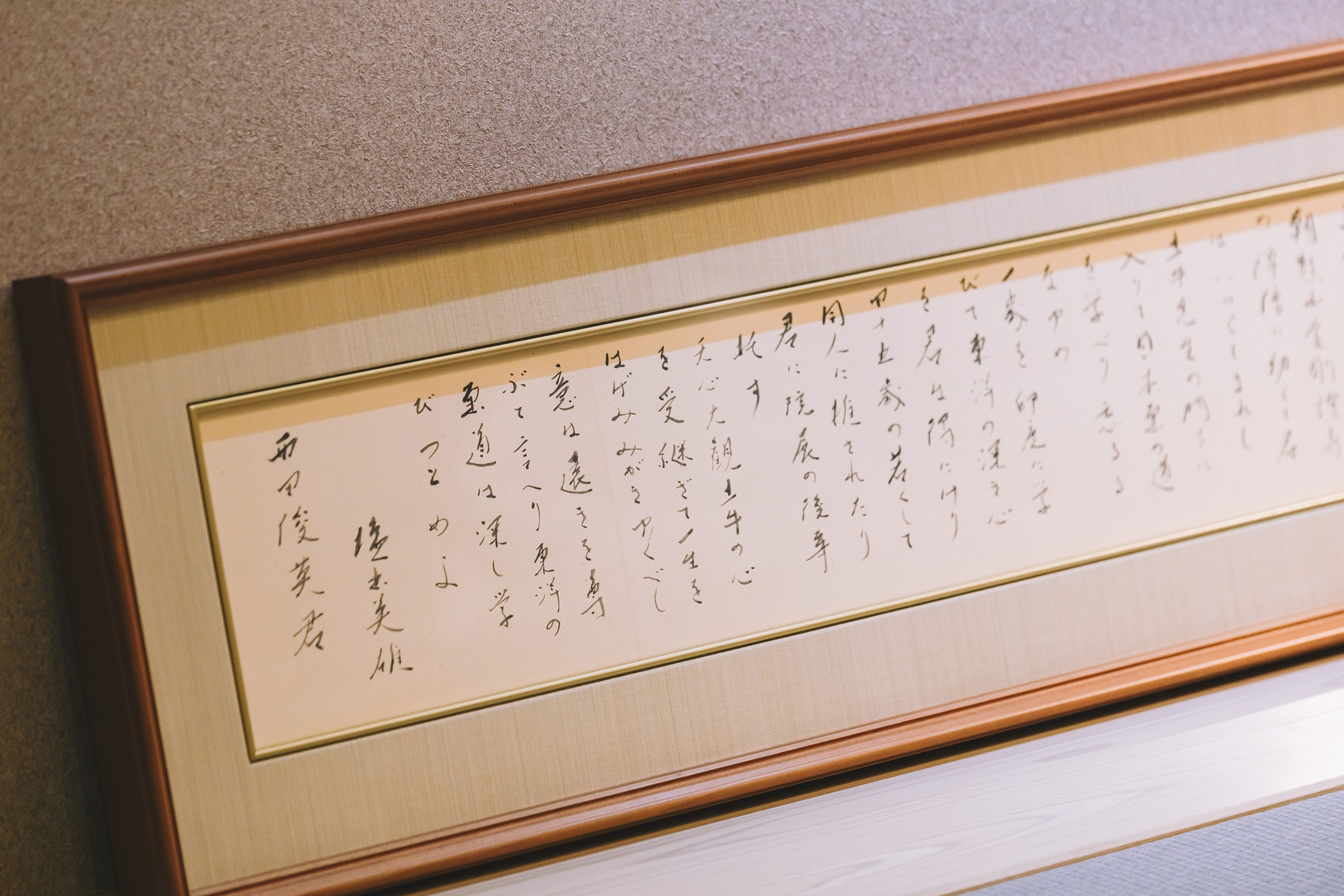 僕には、奥村土牛先生と塩出英雄先生という師がいます。ここにあるのは、塩出先生からのお手紙。僕は1988年に、先生の弟子として初めて院展の同人になったんですね。同人とは日本美術院の最高位で、運営にも携わる作家のこと。そのことを祝ってしたためてくださったものです。ふだんは自宅の玄関ロビーに飾ってあり、1日1回は必ず眺めています。