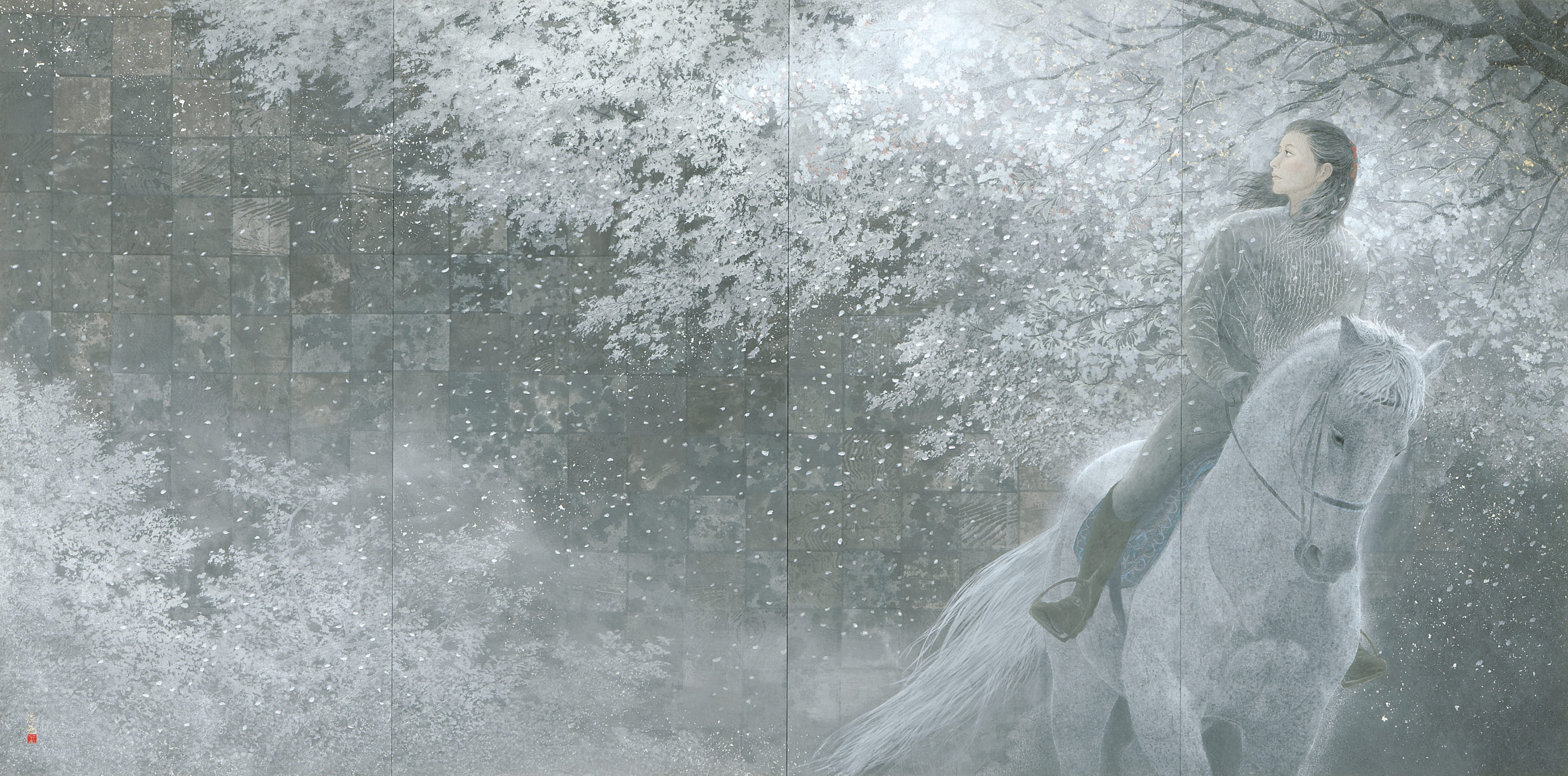 「先生を忘れがたい惜別の思いと、それでも進まなければとの覚悟の思いを、白馬と振り向く女性の姿に重ねました。塩出先生も奥村先生も師の7回忌に桜の絵を描いたので、僕もどうしても描きたかったのです」